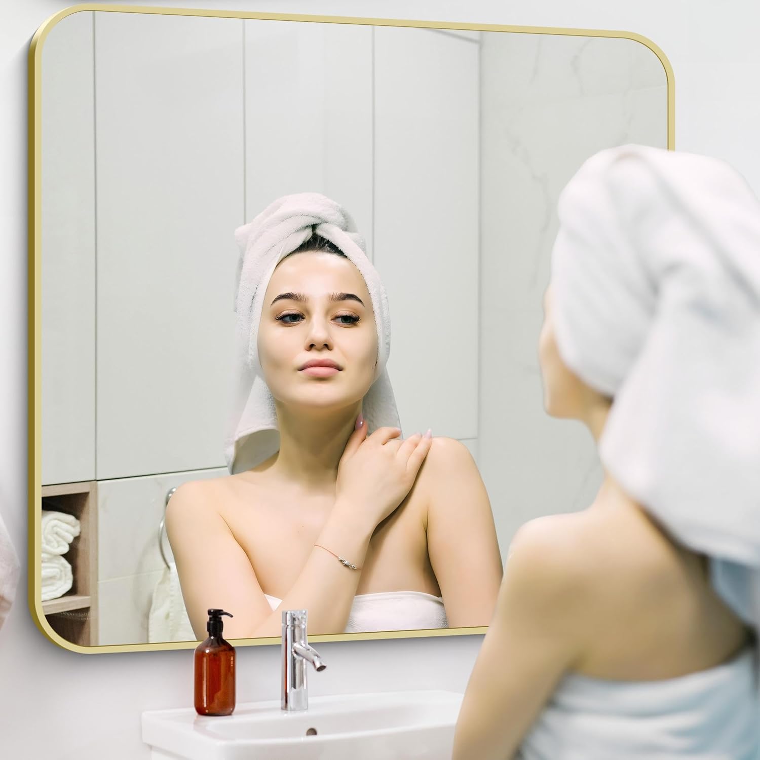 - MODERN STYLE GOLD BATHROOM MIRROR: The dimensions of this bathroom mirror is 42 x 42 inch, perfect size for you to get a true and reliable images at multiple angles and distances. Designed minimalist modern style combine practicality and aesthetics. Suitable for anywhere a mirror might be needed. Such as bathroom, cloakroom, dressing room, living room, bedroom, entryway. Bring more style and brightness to your home. It's also a wonderful housewarming gift for friends and families.