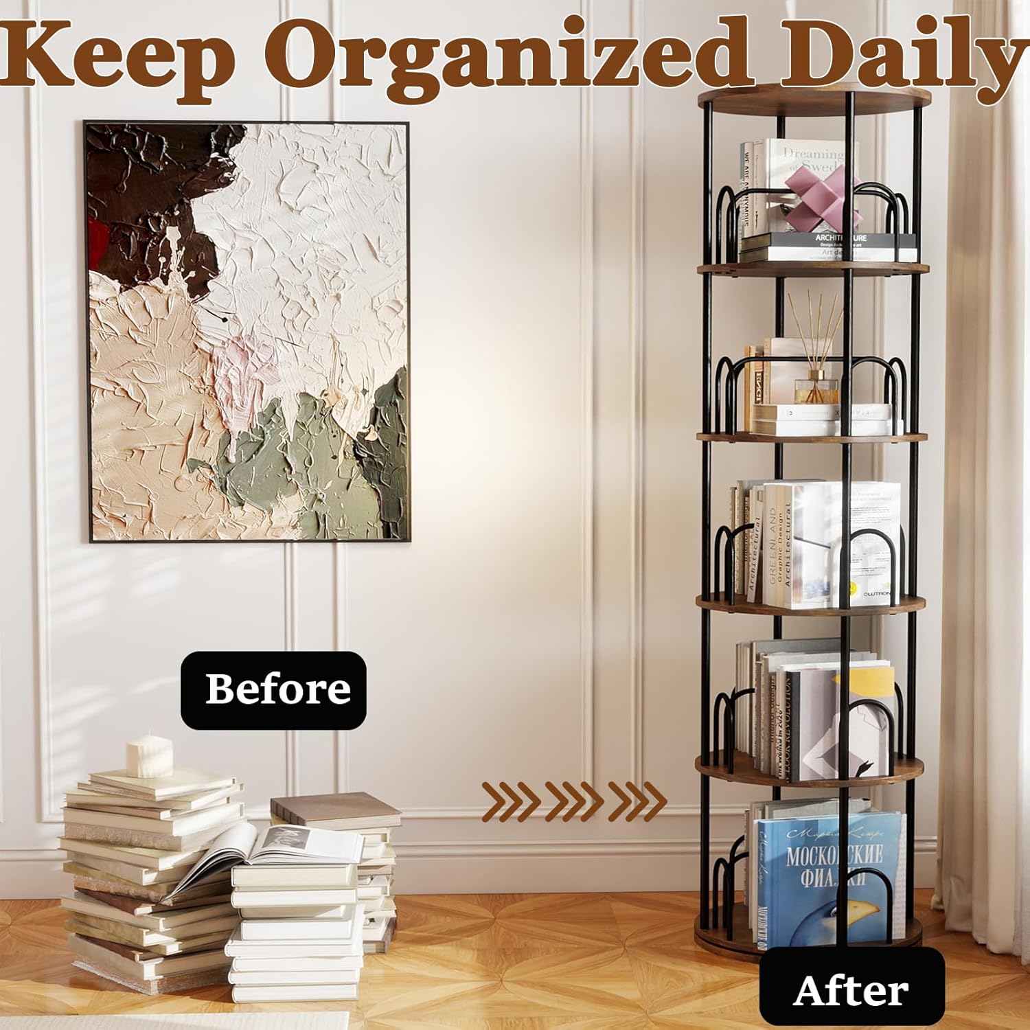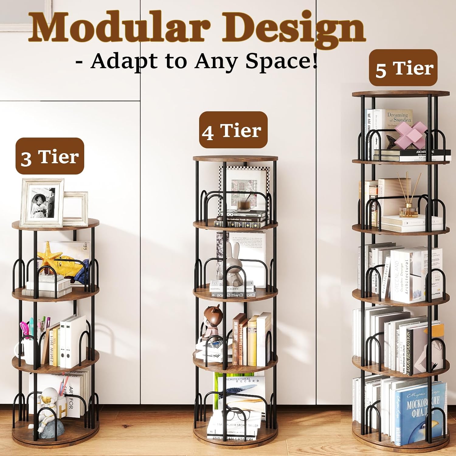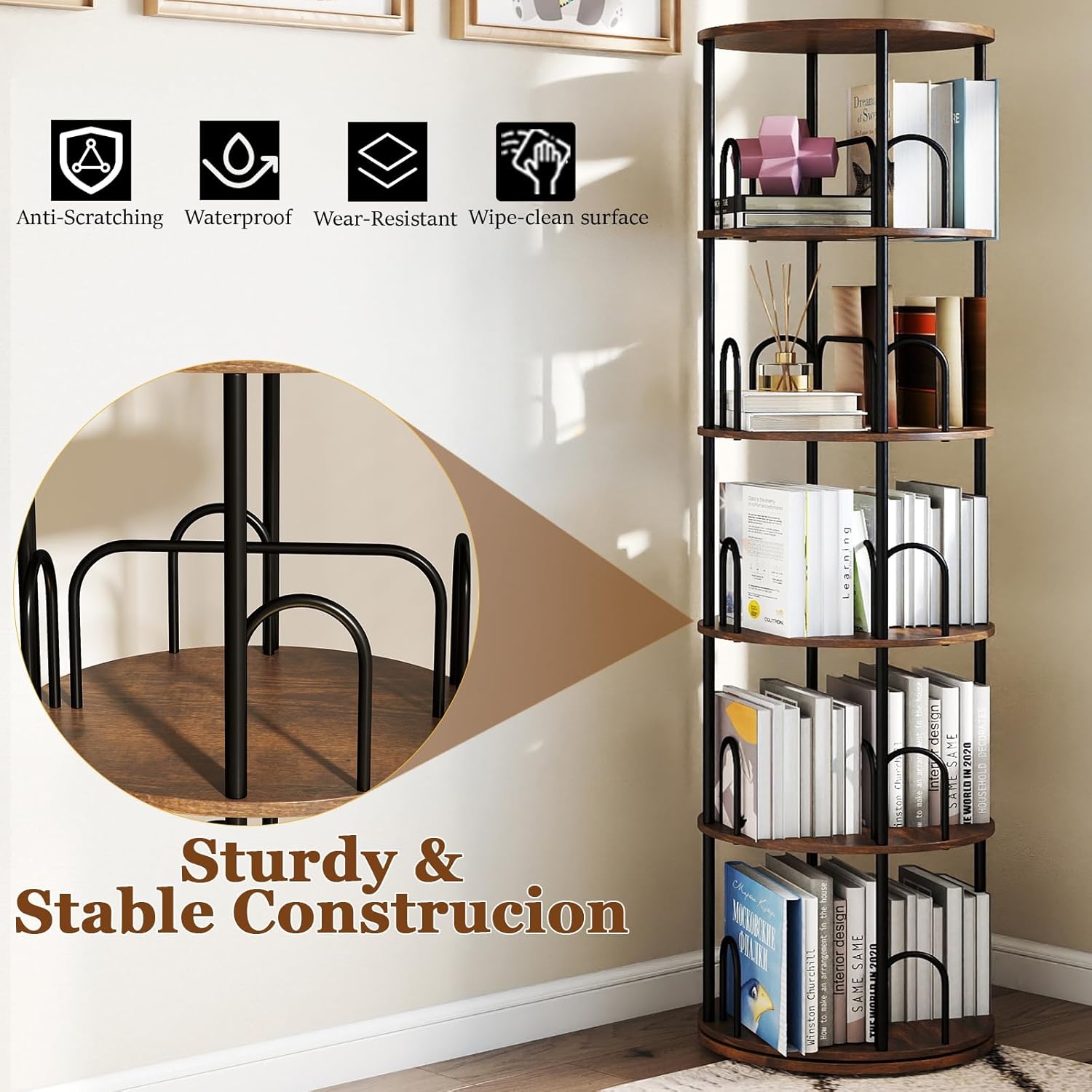 • 𝟓-𝐓𝐢𝐞𝐫 𝐋𝐚𝐫𝐠𝐞 𝐂𝐚𝐩𝐚𝐜𝐢𝐭𝐲 – 𝐇𝐨𝐥𝐝𝐬 𝐮𝐩 𝐭𝐨 𝟏𝟎𝟎 𝐒𝐭𝐚𝐧𝐝𝐚𝐫𝐝 𝐁𝐨𝐨𝐤𝐬: The tall rotating bookshelf offers five spacious tiers to neatly store books, decor, toys, or office supplies. Each tier is designed for stability, making it a reliable floor rotating bookshelf for daily use.