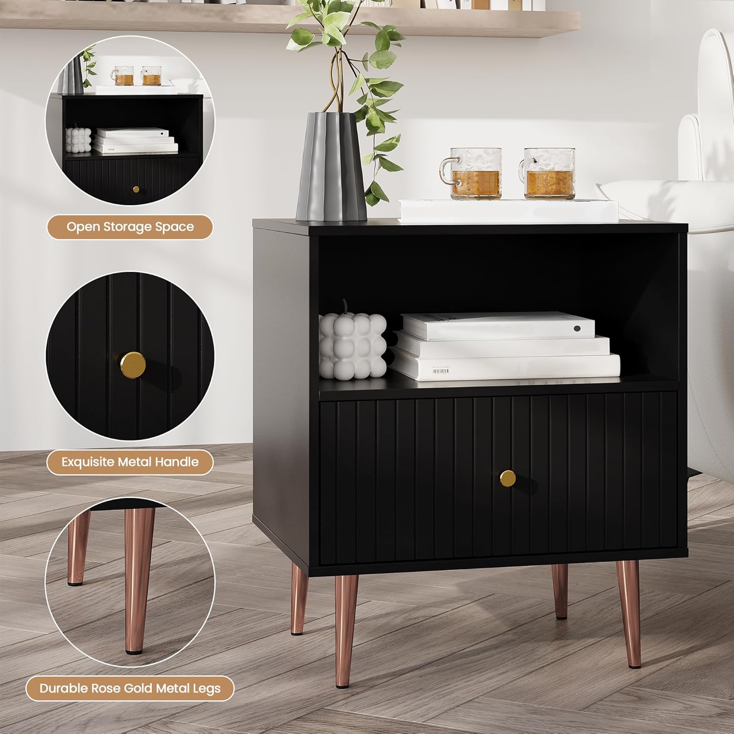 Black Night Stand Set 2,Modern Bedside Table with Door and Open Storage,Fluted Nightstand and Wood End Side Table with Rose Gold Metal Legs and Handles for Bedroom,Living Room,Black