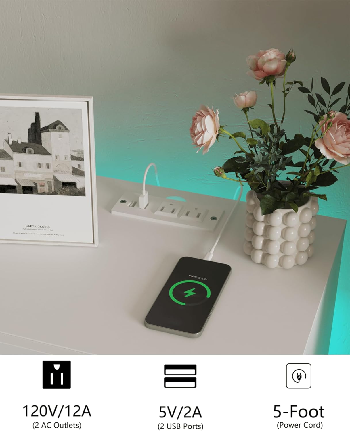 White Nightstand with Charging Station and LED Lights,Modern Bedside Table with 2 Storage Drawer,Night Stand with Solid Wood Legs,White (White-2)