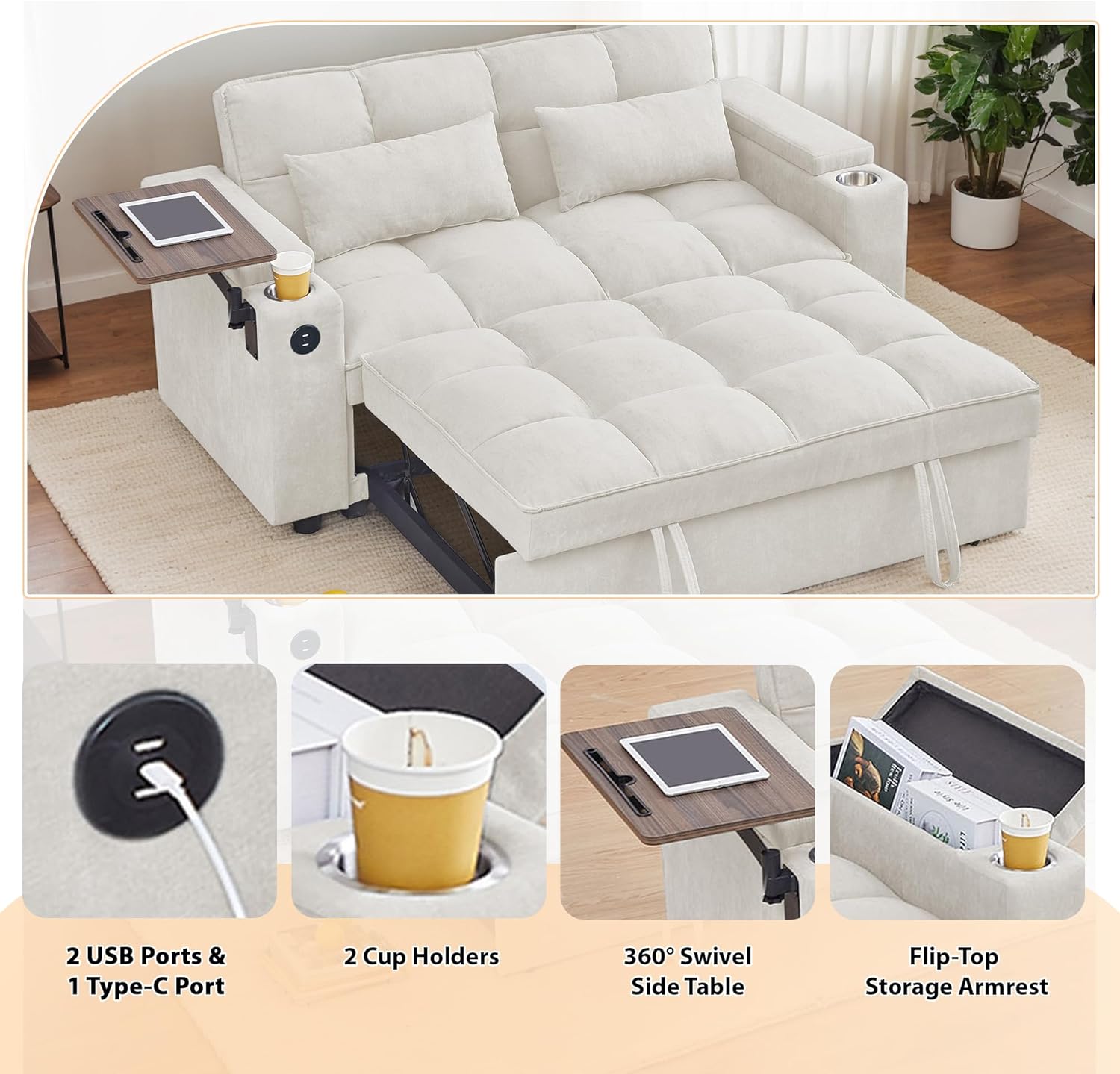 - ★ Features : This sofa bed built-in USB and Type-C charging ports, perfect for charging your devices. Hidden storage and cup holders store your drinks. It is also designed with a 360° rotating side table, providing a flat surface to make your work and life easier and more convenient.