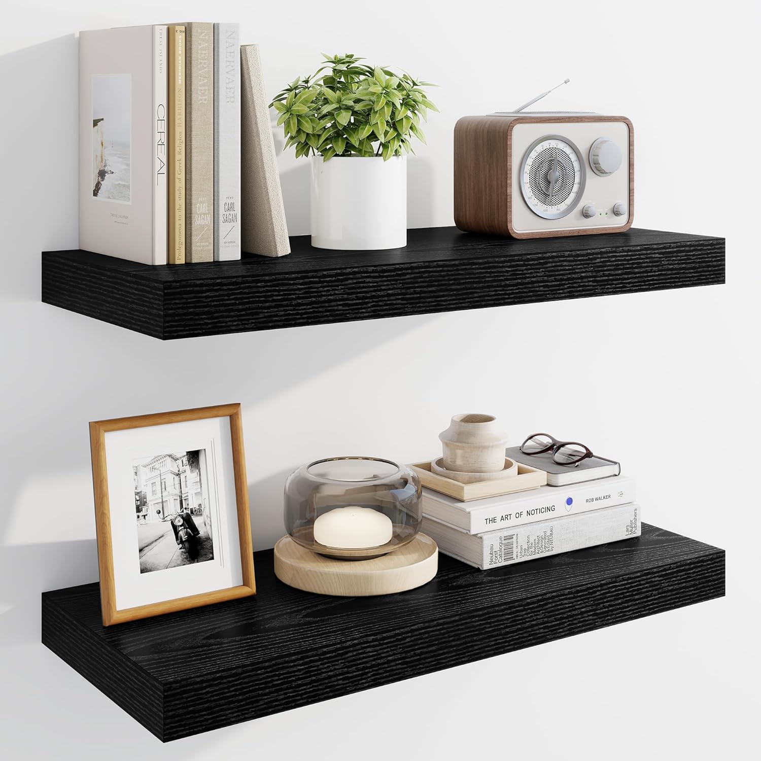 Marsmiles 24" Floating Shelves for Wall, Wooden Shelves with Invisible Brackets Set of 2, Rustic Farmhouse Wall Mounted Shelf for Kitchen Bathroom Living Room Study, Black