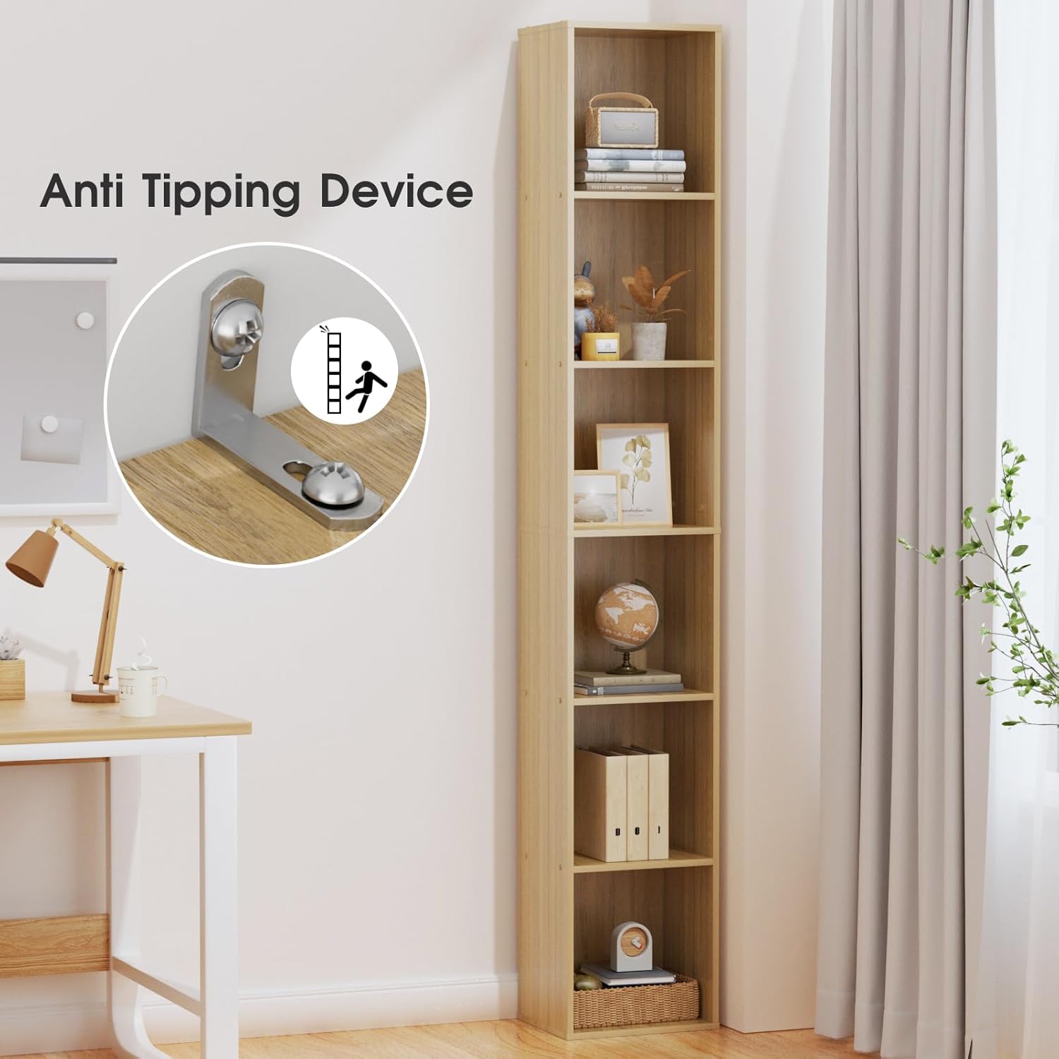 Tall Narrow Bookshelf 6-Tier Bookcase,70.5" Skinny Thin Corner Shelf Slim Storage Cabinet,Wood DVD CD Media Cube Organizer Tower Rack for Small Spaces, Bedroom, Living Room, Office,Natural