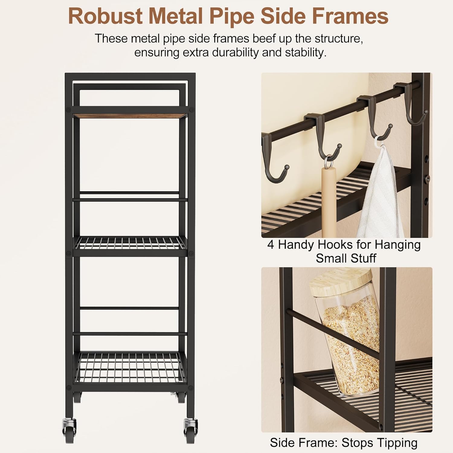 - 【Metal Pipe Side Frames & 4 Hooks】 The metal pipe sides of microwave stand don't just reinforce the cart—they also keep your stuff from taking a tumble. And those 4 built - in hooks? Perfect for tossing mugs, spatulas, dish towels, or even oven mitts. Stash your essentials and keep 'em within arm's reach!