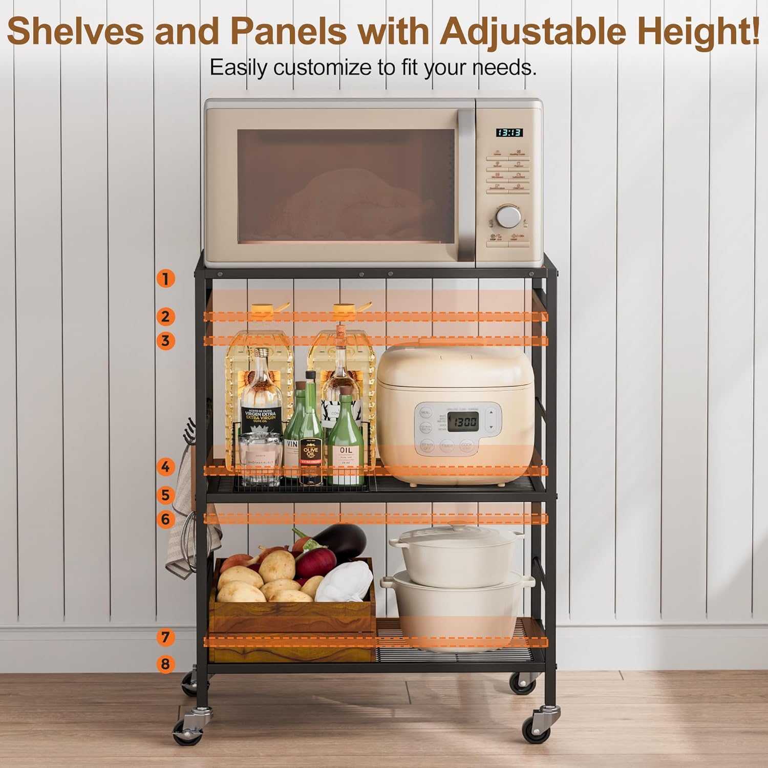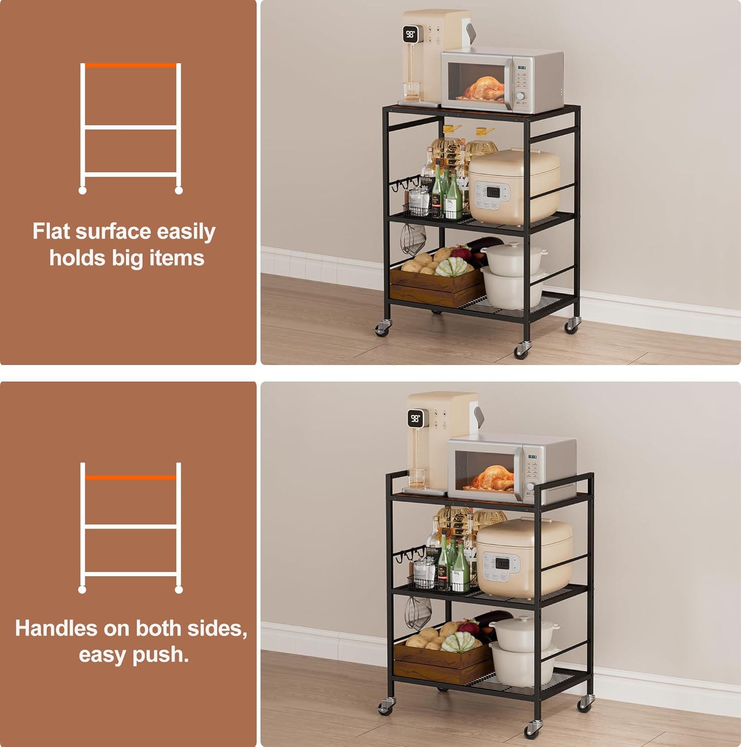 - 【Flexible Shelf Heights】The Microwave storage cart is built for real - life versatility. Just tweak the shelves using different mounting holes to fit everything from bulky air fryers to tiny spice jars. Plus, the top wooden panel? You can either set it flush for hassle - free storage of big items or lower it to create a built - in handle with a guardrail—no sweat!