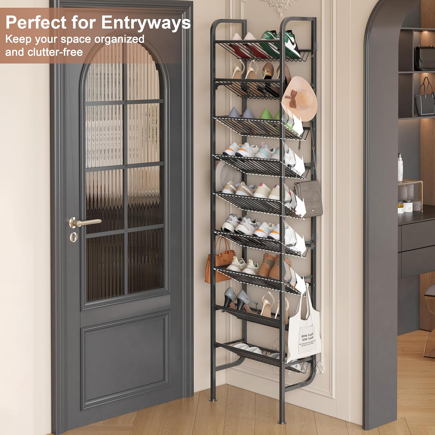 UMDONX 9 Layer Shoe Rack for 18 Pairs Shoes, Freestanding Shoe Organizer with 12 Hooks & 8 Adhesive Pads, Space-Saving Vertical Storage for Entryway and Walk-in Closet