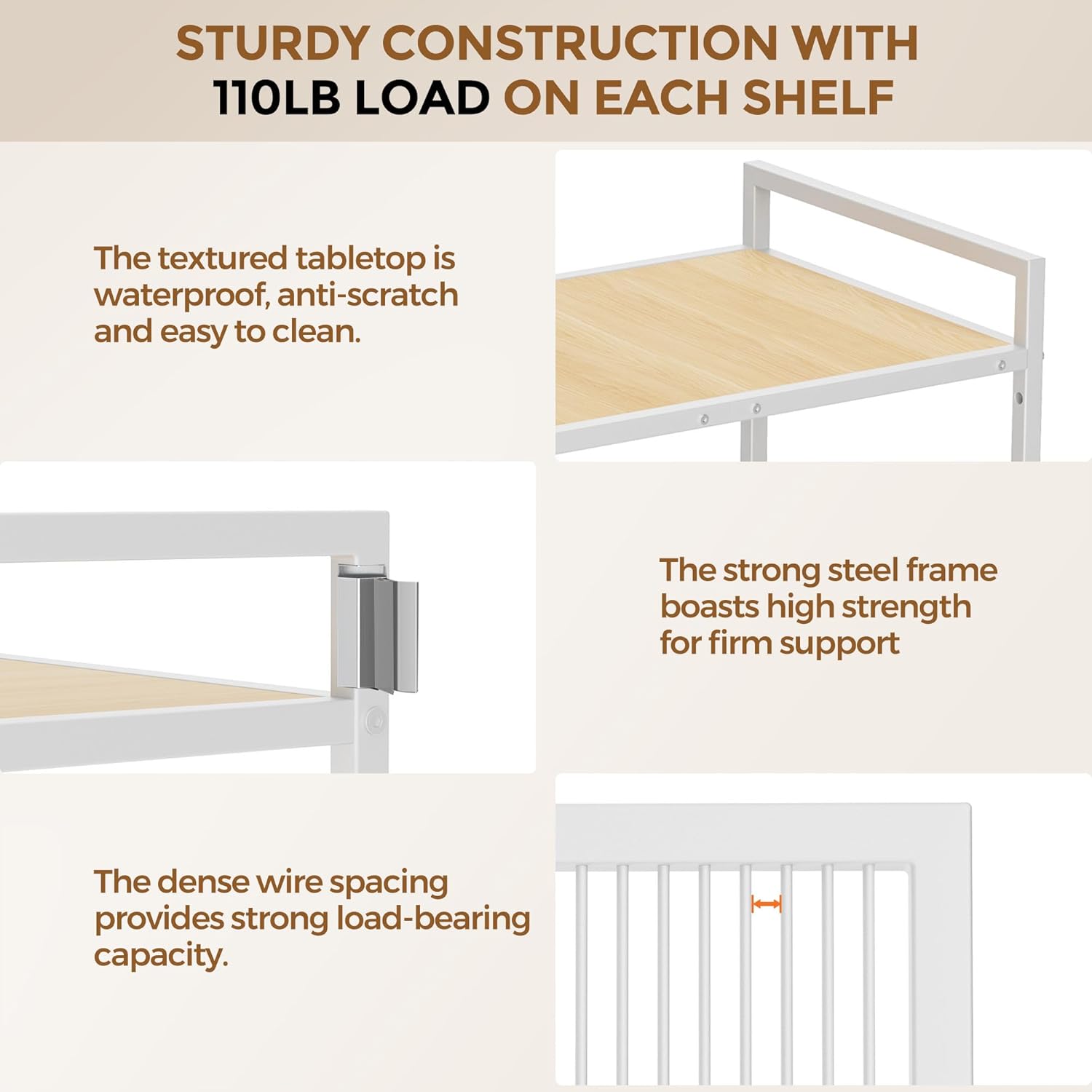 - 【Sturdy Construction With 110lb Load On Each Shelf】XIVIRACK kitchen storage rack organizer are made high quality materials.The textured engineered wood tabletop is waterproof, anti-scratch and easy to clean.The strong steel frame boasts high strength for firm support.The dense wire spacing provides strong load-bearing capacity.
