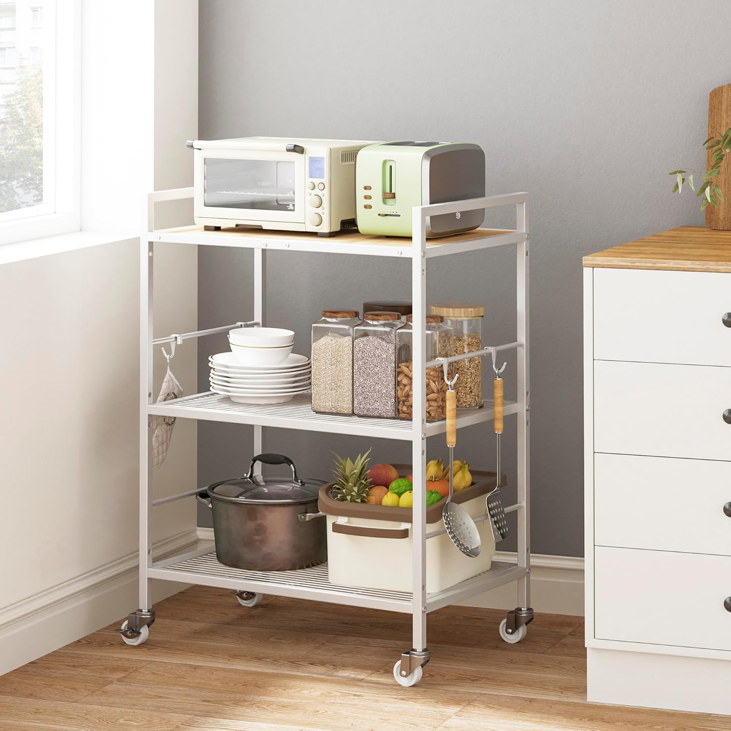 3-Tier Metal Storage Rack with Industrial Wheels,Mesh Shelving Unit with Wooden Table top,Adjustable Shelf,23.6-Inch Width,15.8-Inch Depth, for Kitchen, Laundry,Pantry,Plant,white