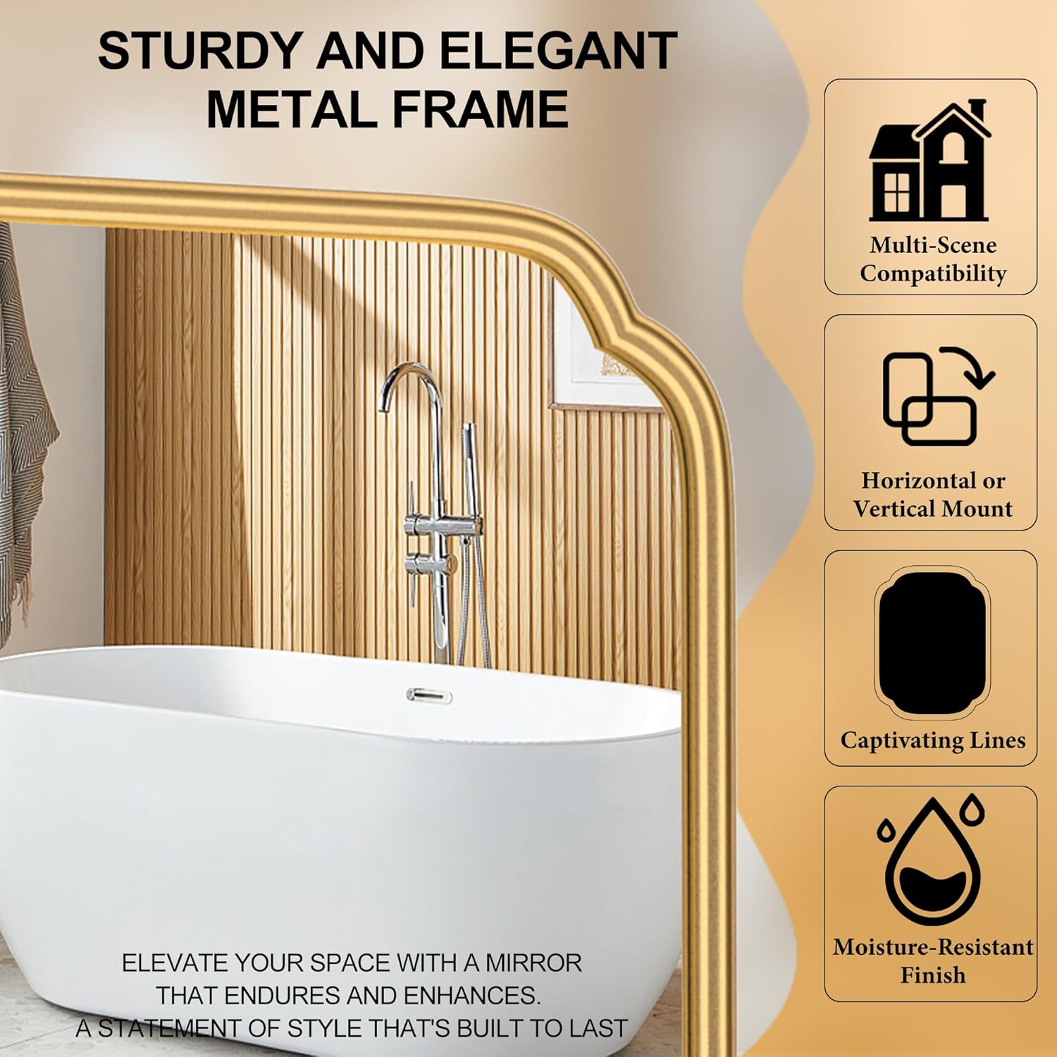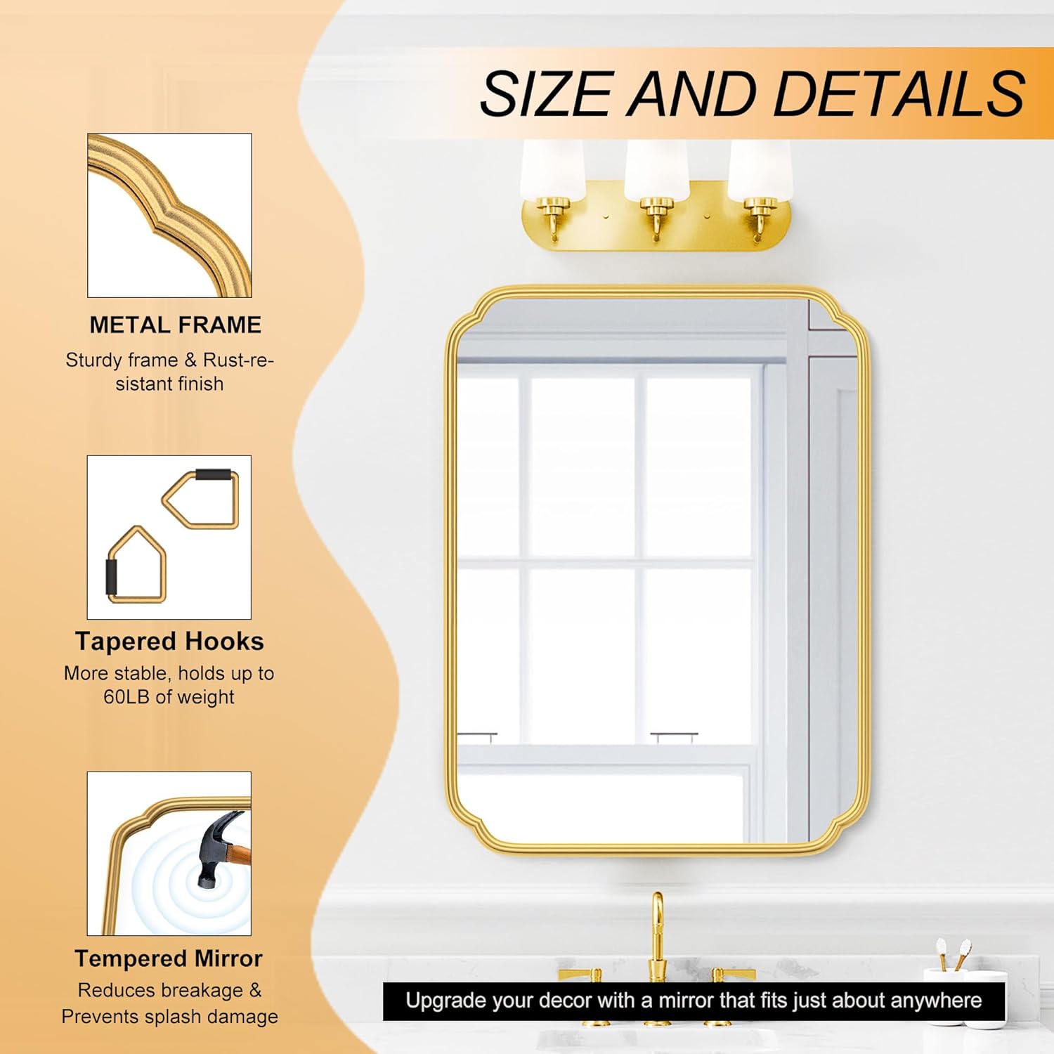 - 【A Unique Elegant-Looking Mirror 】:The gold bathroom mirror, overall design and the sleekness of the curves in the frame and it adds a classiness as opposed to a boring straight square mirror. A very versatile mirror that will raise the level of decor anywhere in the house. The rounded corners mirror is classic and will never go out of style