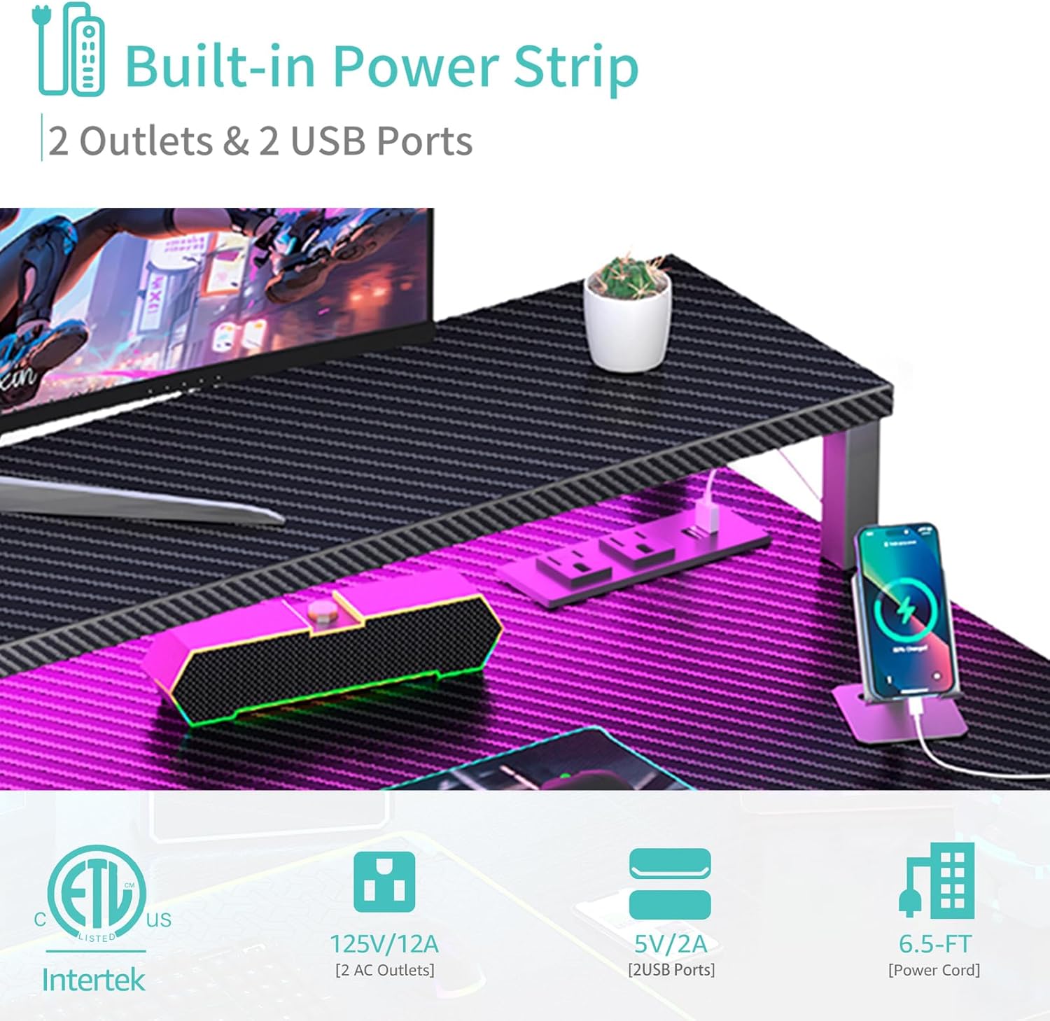 - Safety Multi-functional Power Strip: The computer desk includes a built-in power strip with 2 power outlets & 2 USB charging ports for your computer, monitor, gaming gear, pad, phone and other electronic devices