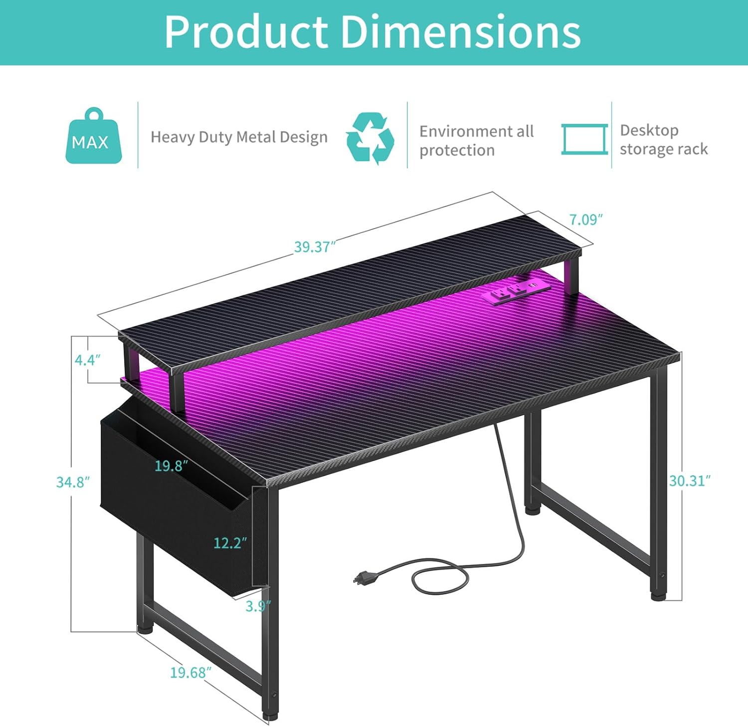 Lufeiya Gaming Desk with Power Outlets and LED Lights, 40 Inch Gamer Desk Table with Charging Station, Home Office Computer Desks with Monitor, Black