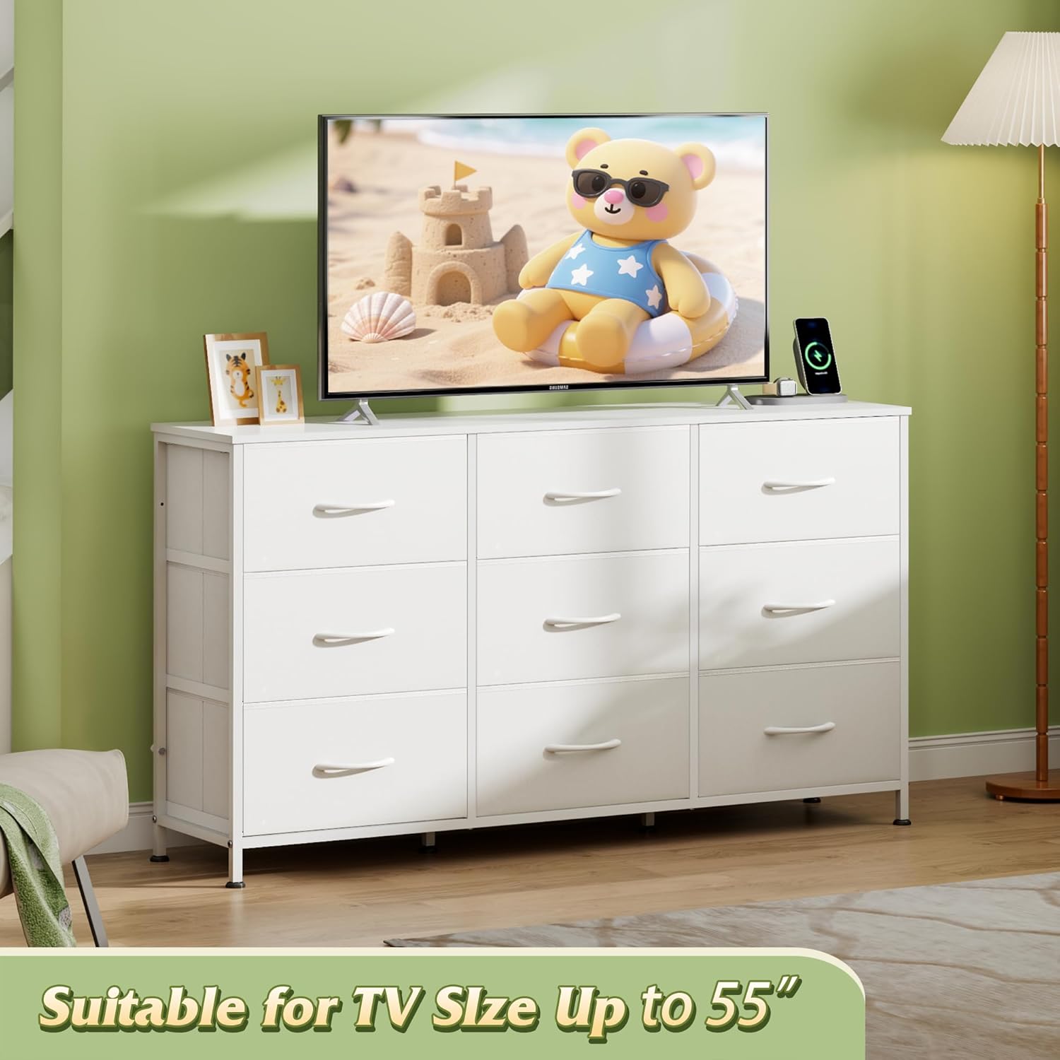 WLIVE 47''W Dresser for Bedroom, White Dresser TV Stand for 45, 50, 55 inch TV, Wide Chest of Drawers with 9 Drawer, Large Entertainment Center, Fabric Dressers with Wood Top for Closet, Living Room