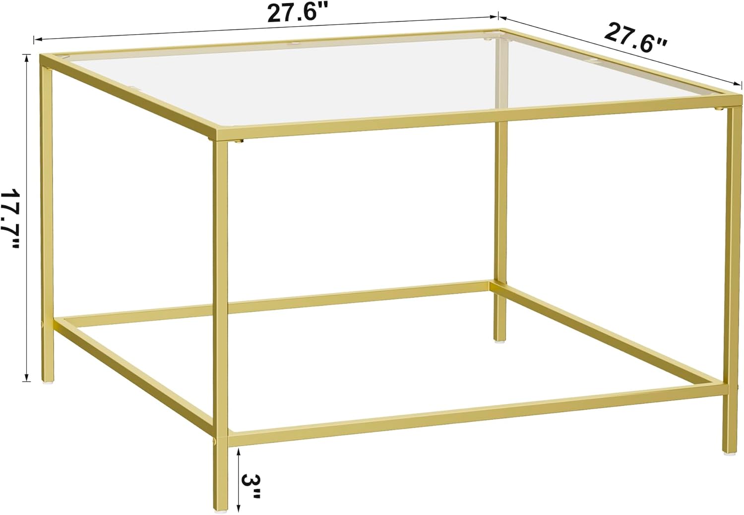 Glass Coffee Table, Modern Square Coffee Table for Living Room, Minimalist Center Tea Table with Sturdy Metal Frame for Apartment, Office, Easy Assembly, 27.6 x 27.6 x 17.7 Inches, Golden