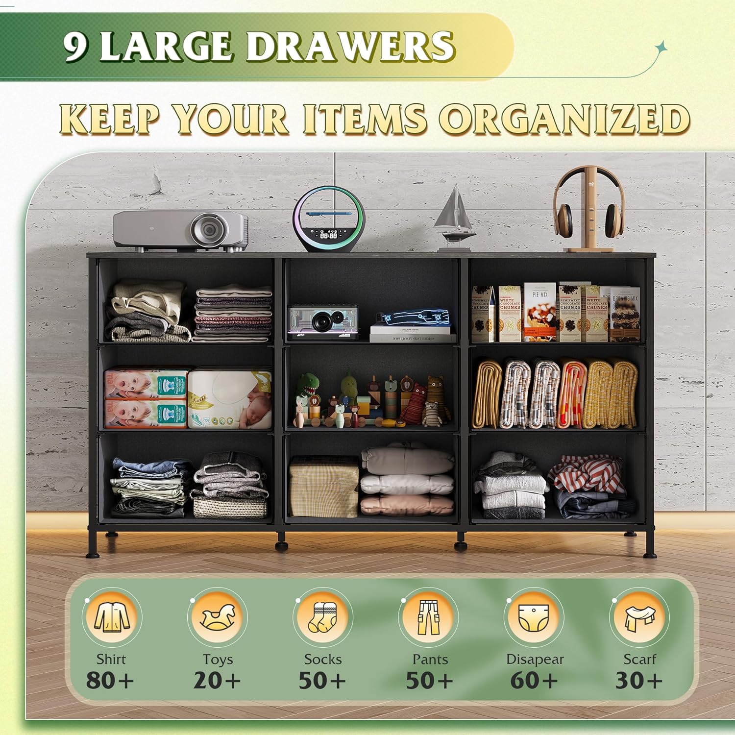 WLIVE 47''W Dresser for Bedroom, Black Dresser TV Stand for 45, 50, 55 inch TV, Wide Chest of Drawers with 9 Drawer, Large Entertainment Center, Fabric Dressers with Wood Top for Closet, Living Room