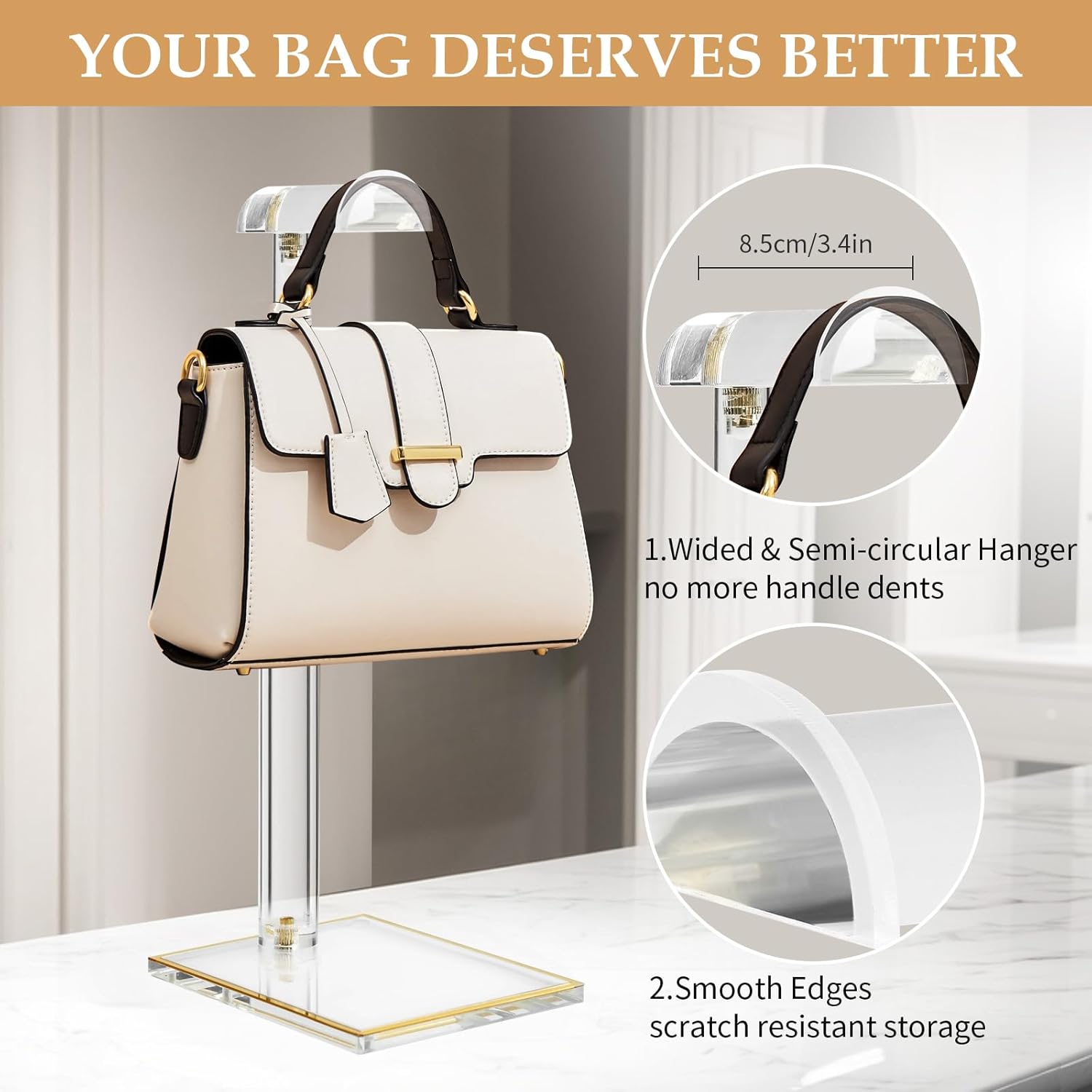 - 8.5MM Non-Slip Gold Trim Base: Crafted from durable 8.5mm-thick transparent acrylic (5"-6" base size), this sturdy platform boosts load capacity by 30%. Non-slip silicone pads allow the bag rack to be placed on glass counter / wooden wardrobe without slipping or shifting, while the gold-edge detailing adds a luxurious touch to elevate your display