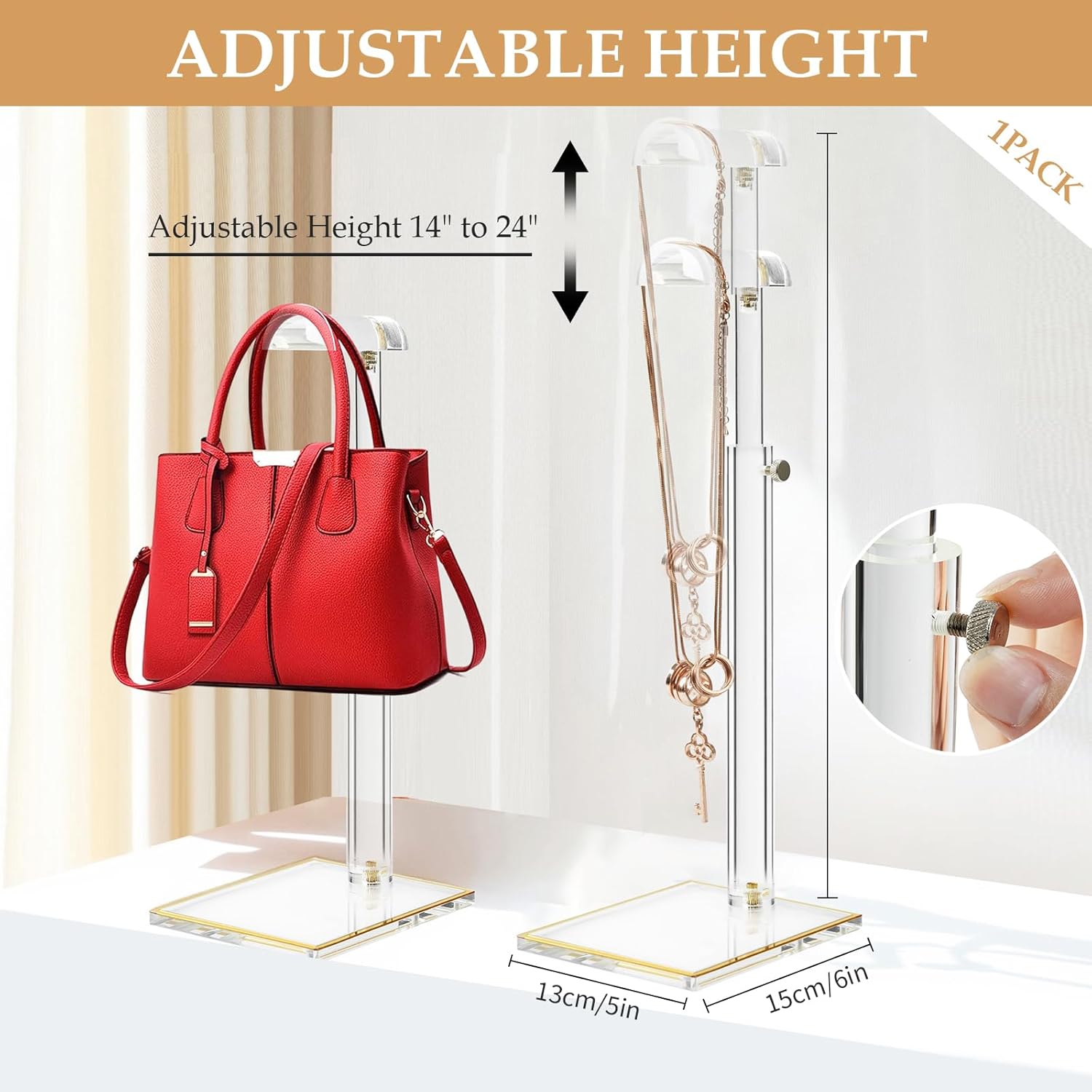 - Adjustable Height (14" to 24"): Customize your display effortlessly with a height-adjustable acrylic purse stand (14-24 inches). Perfect for showcasing bags, wallets, jewelry, and accessories of varying sizes while tailoring presentations to your unique style