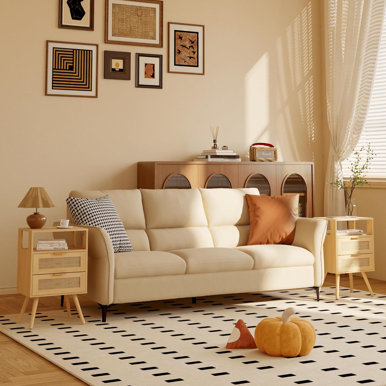 Rattan Nightstand,Farmhouse Bedside Table with 2 Storage Drawer and Open Wood Shelf, for Bedroom and Small Spaces,Night Stand with Solid Wood Legs (Yellow Oak)