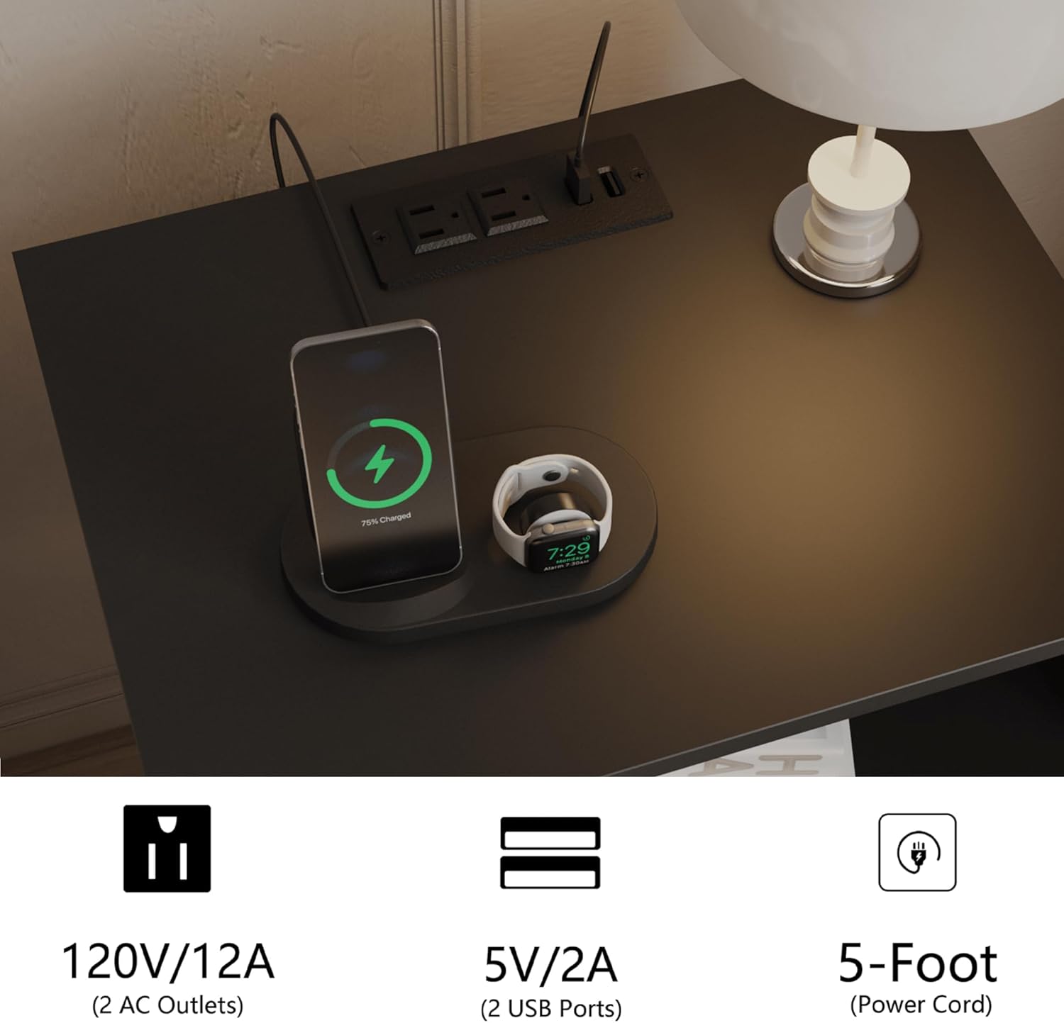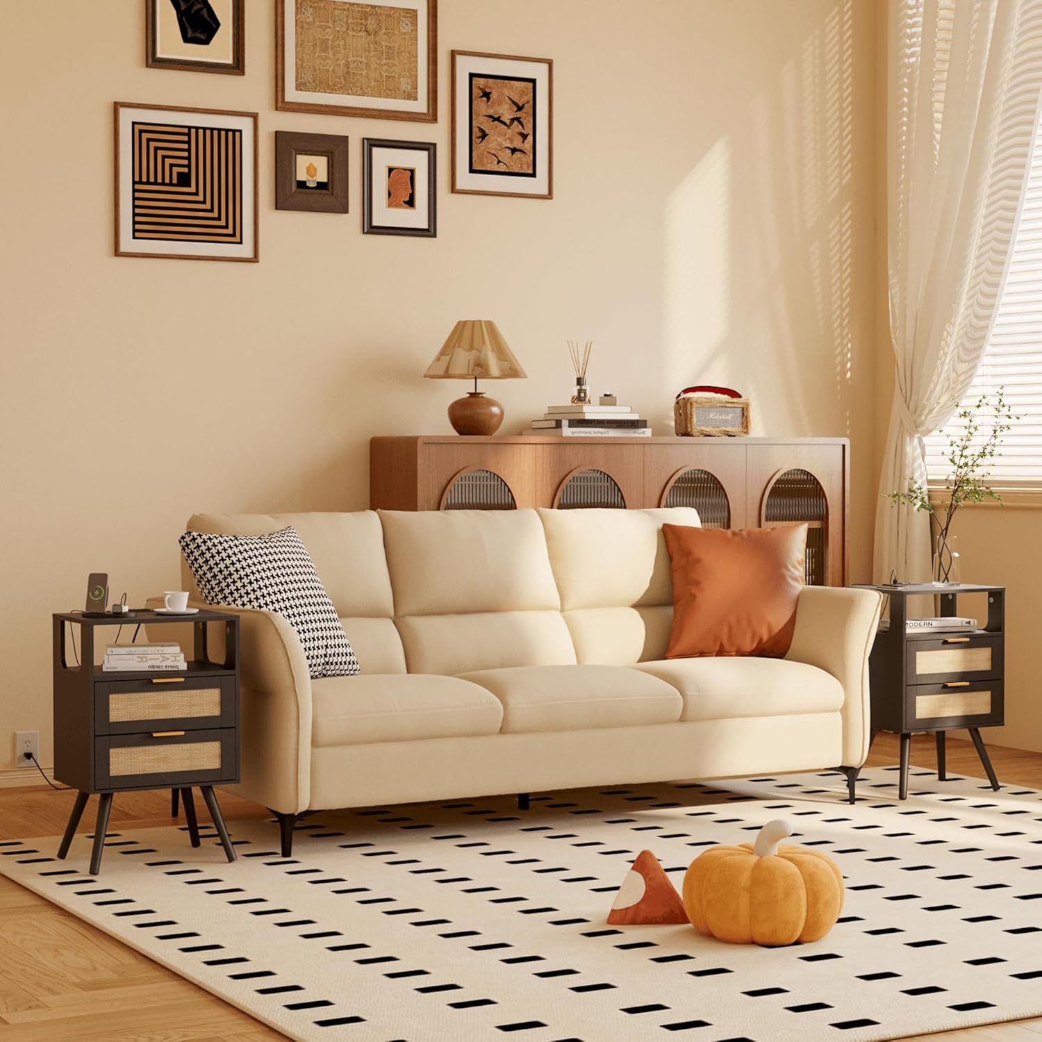 Rattan Nightstand with Charging Station,Farmhouse Bedside Table with 2 Storage Drawer and Open Wood Shelf, for Bedroom and Small Spaces,Night Stand with Solid Wood Legs (Black-Outlet)