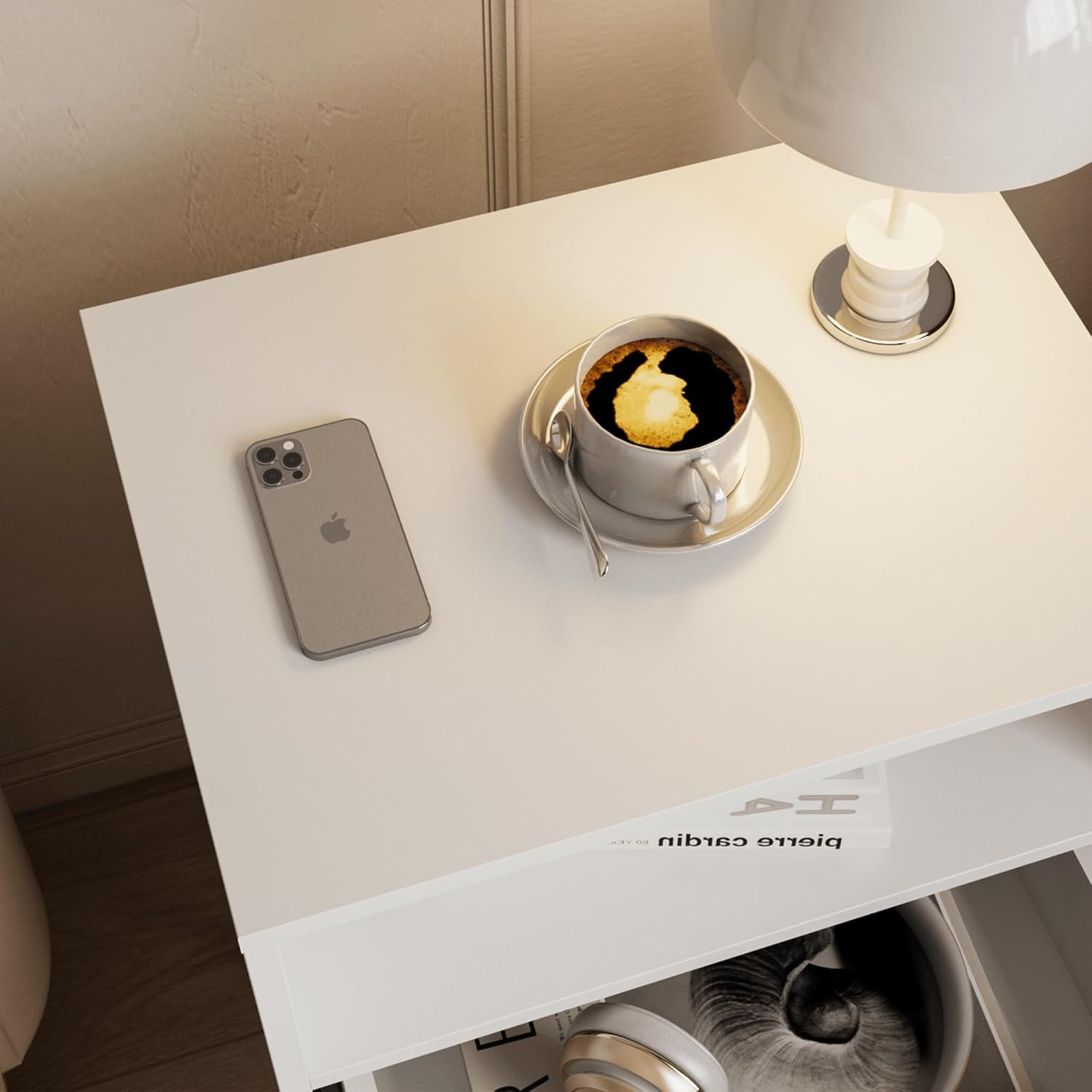 - Small Side Table for Small Spaces:This nightstand is small but has a lot of space,with two storage drawers and open wood shelf that provides a perfect storage space for your remote control, glasses, medicines and other essentials close at hand. The wide top is perfect for displaying a lamp, clock, potted plant or photo frame to offer warmth and personalized decoration.