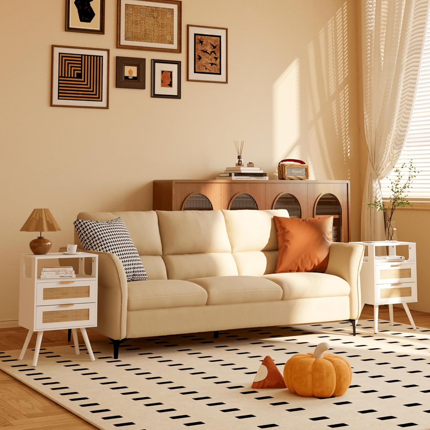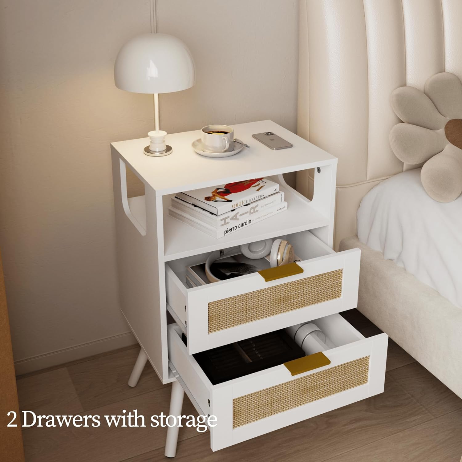 Rattan Nightstand,Farmhouse Bedside Table with 2 Storage Drawer and Open Wood Shelf, for Bedroom and Small Spaces,Night Stand with Solid Wood Legs (White)