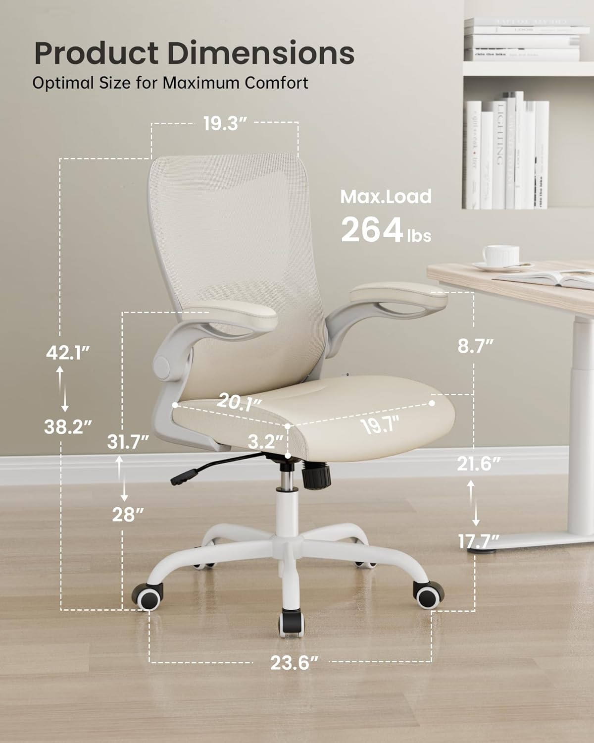- 【Space Saving】The armrests of this desk chair can be flipped up 90° to fit different needs and save space. You can slide the chair under the desk when not in use. The armrests are contoured to match your arms’ shape and have soft padding to protect your wrists and elbows. The computer chair can be adjusted in height by 3.74 inches and swivel 360° for convenience.