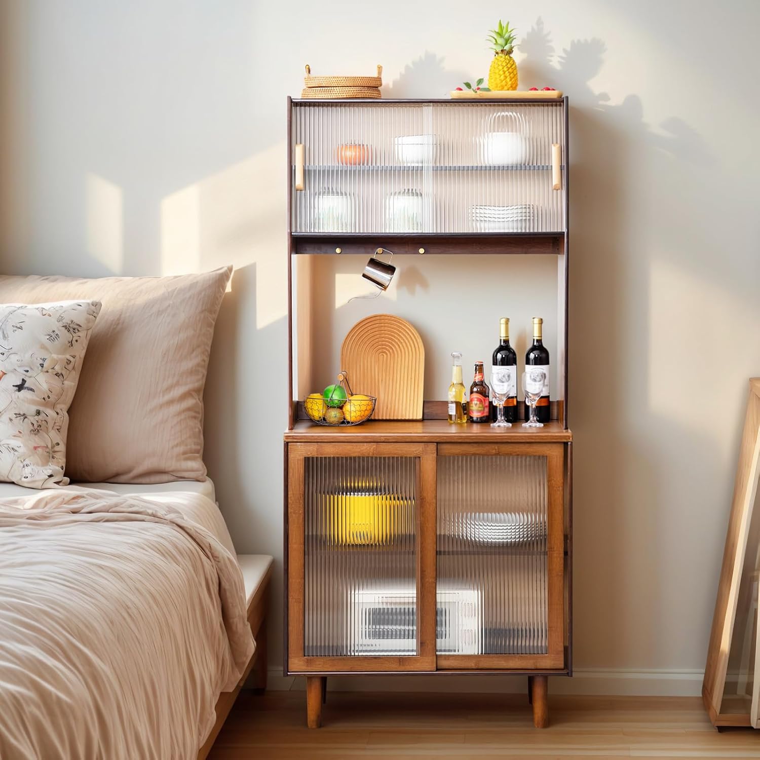 - Kitchen Hutch with Large Storage: This kitchen hutch with countertop offers smart storage with a drawer, open shelf, glass sliding doors, and enclosed bamboo cabinets. Whether used as a buffet hutch, rattan sideboard, or small bar cabinet, it keeps everything neat and handy