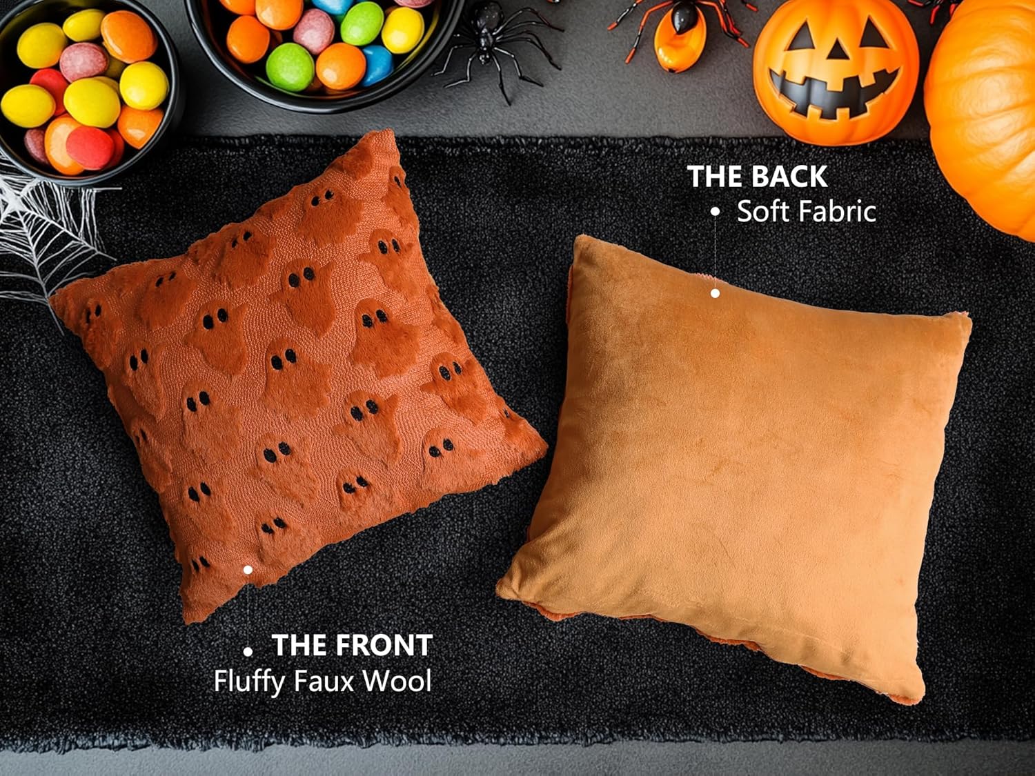 4TH Emotion Halloween Ghost Decorative Pillow Covers 16x16 Set of 2, Rust Red Soft Plush Faux Fur Farmhouse Throw Cushion Cases for Fall Autumn Holiday Home Decorations