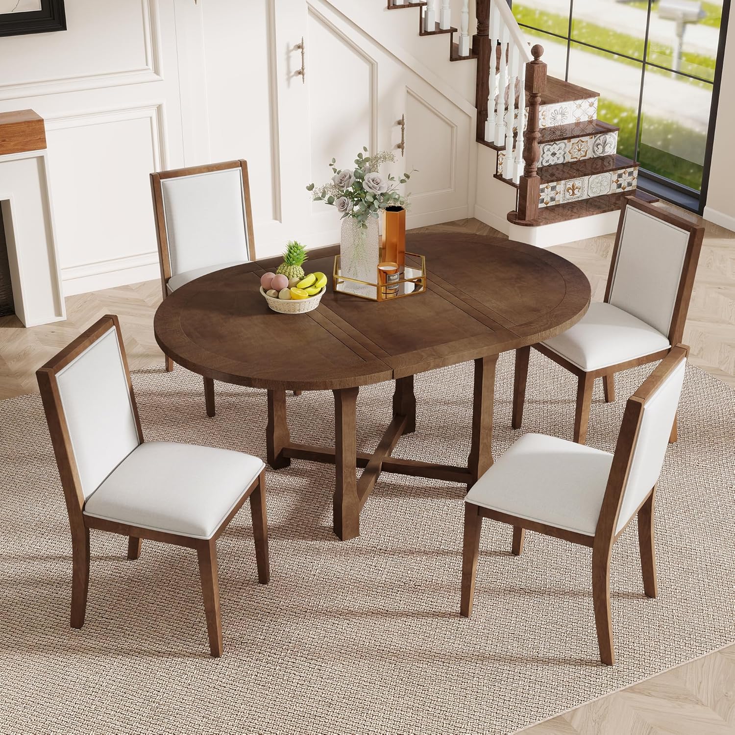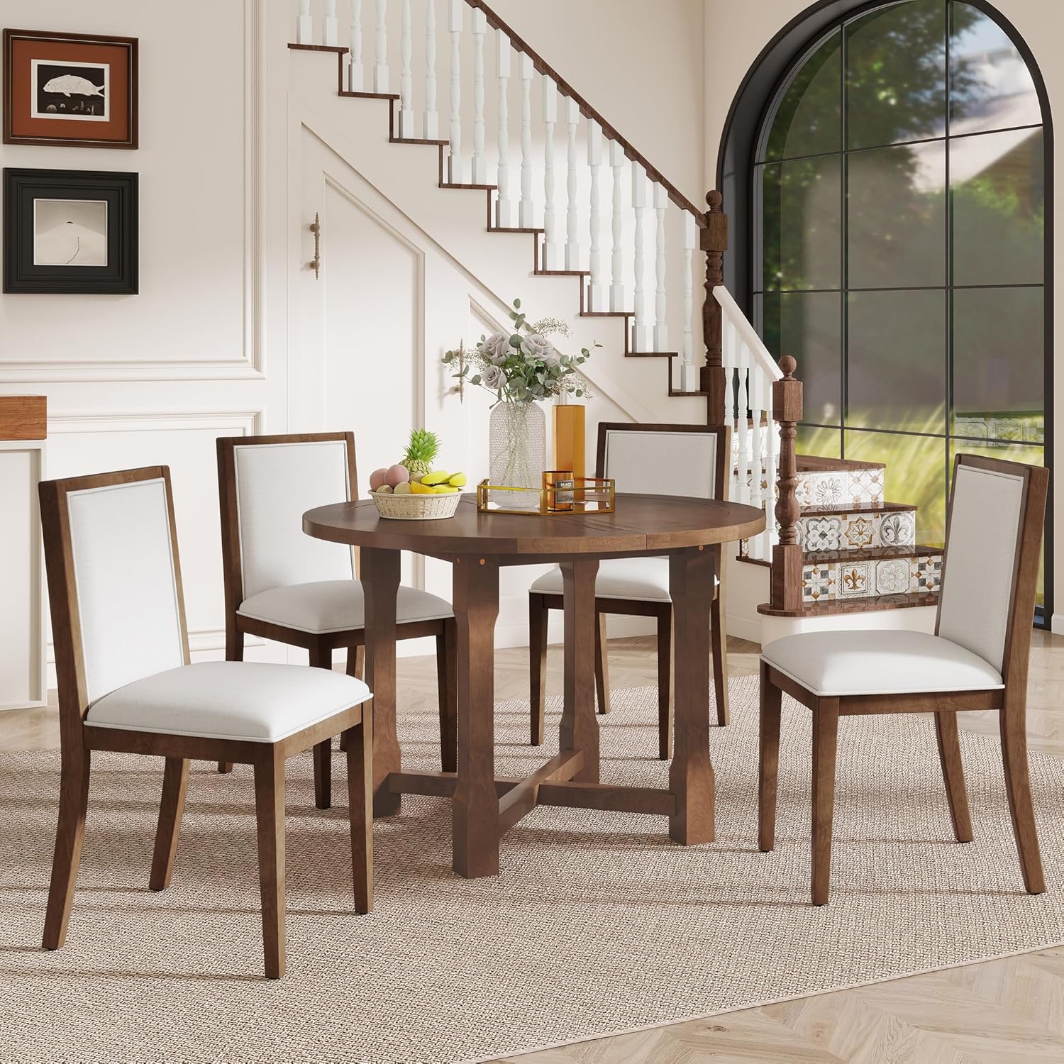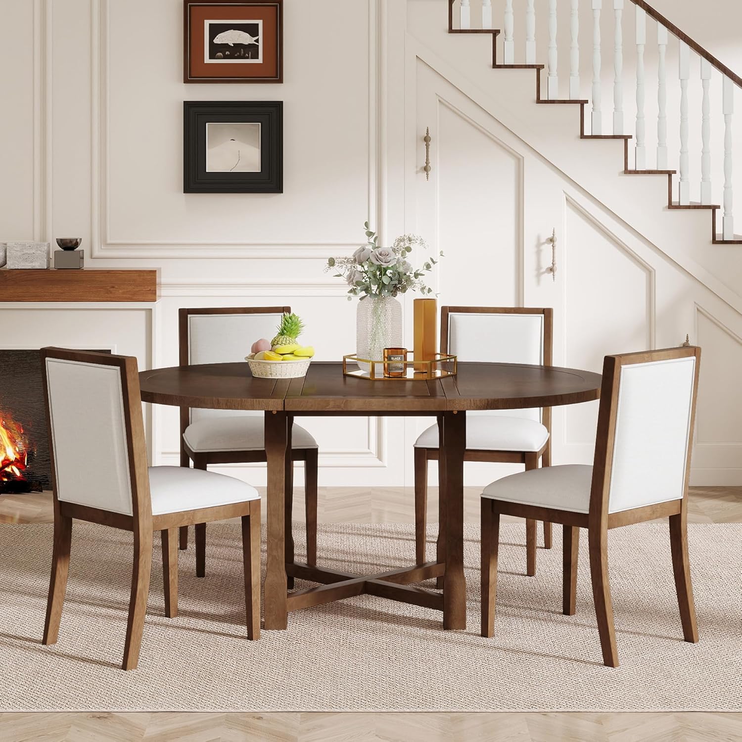 - Classic Farmhouse Dining Table Set: Complete your dining room with this charming 5-piece Dining Table Set from Ball & Cast. Featuring a rustic wooden living room furniture design, it includes an extendable table and 4 upholstered chairs. The natural birch wood veneer adds warmth, making it perfect for small spaces or farmhouse-style homes.