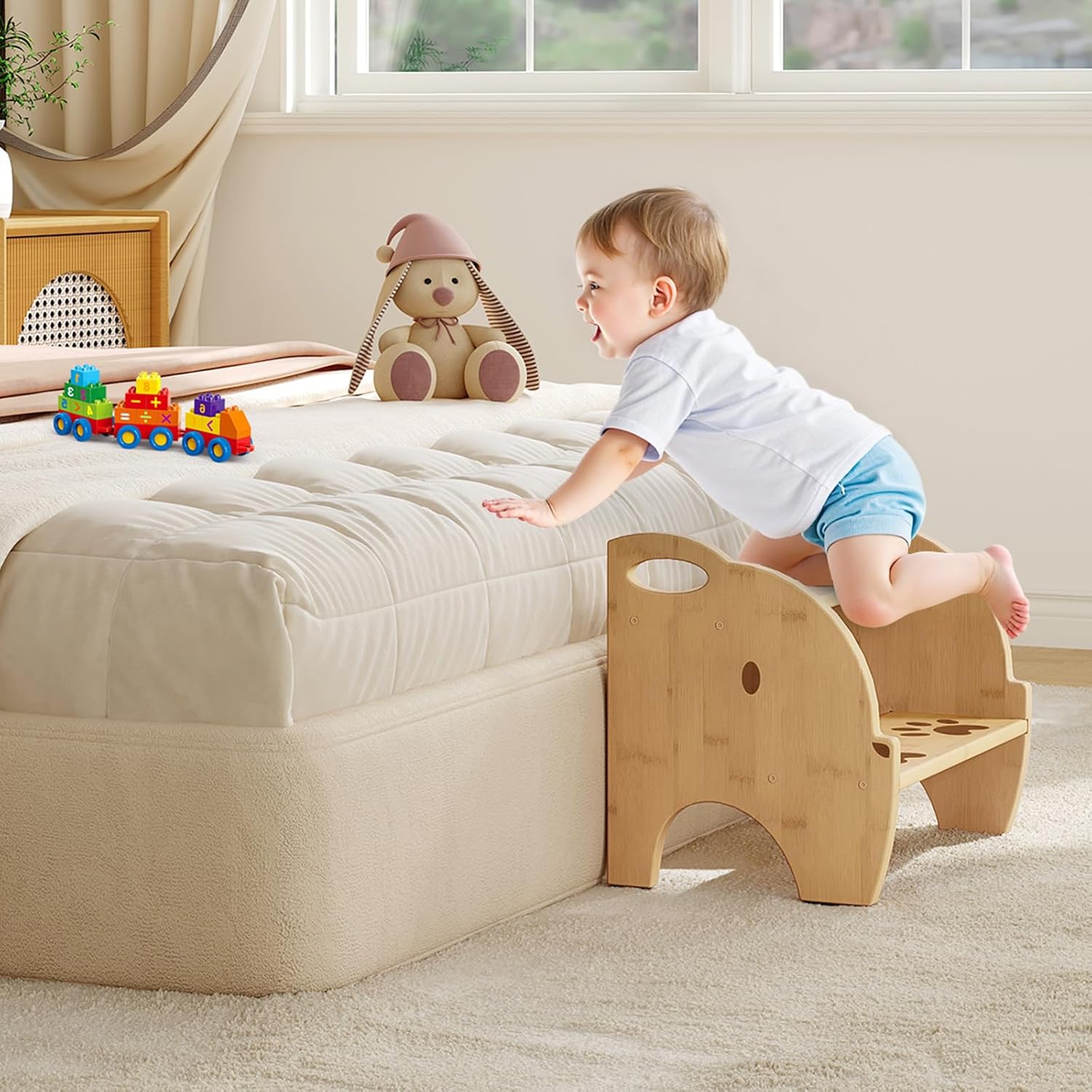 - Adorable Style: With its cute bear shape, rounded edges, and sweet paw print details, this toddler step stool instantly grabs your baby's attention. The warm bamboo color fits any space, making kids willing to use it themselves for daily tasks without the fuss