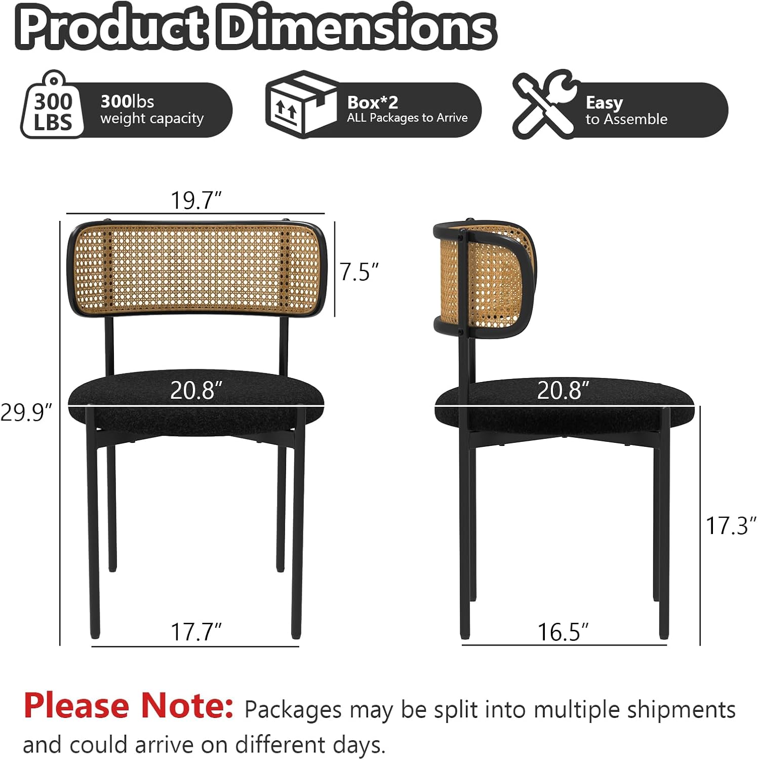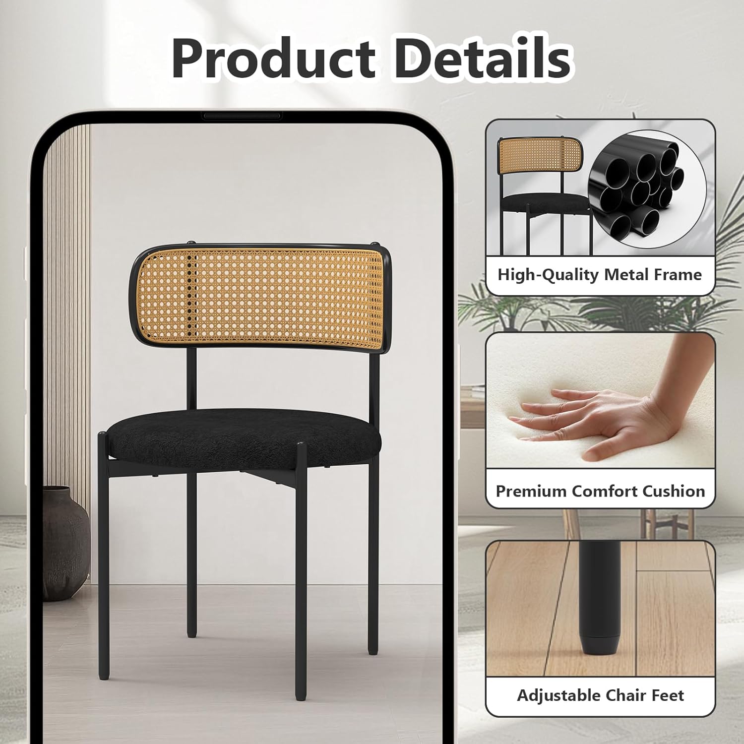 Mid Century Modern Dining Chairs Set of 2 with Rattan Backrest,Velvet Upholstered Accent Kitchen & Dining Room Chairs with Sturdy Metal Frame,Black