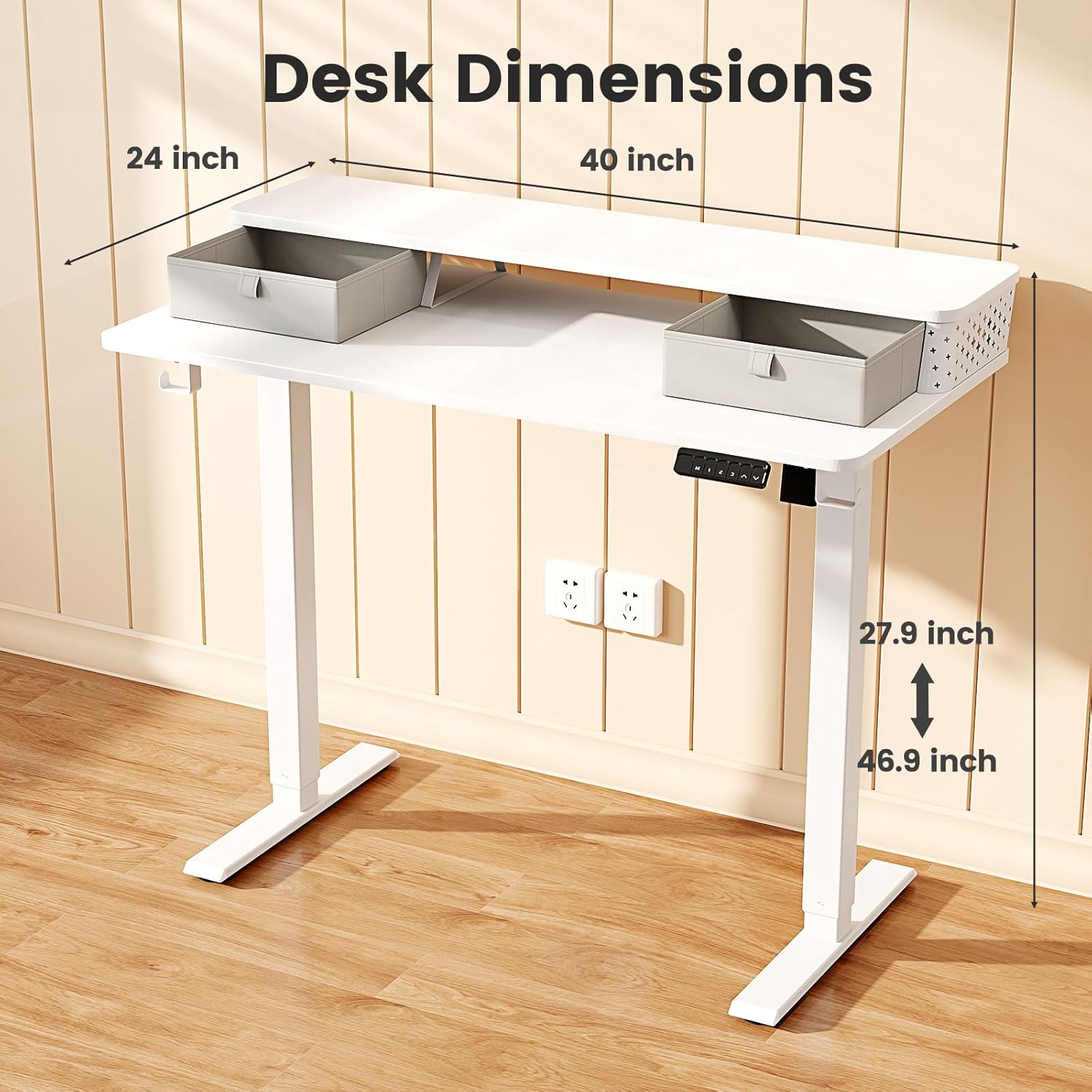 Small Standing Desk with Drawers and Brushless Motor,Electric Sit Stand Desk for Walking Pad,Ergonomic Stand Up Desk for Home Office & Gaming,3 Memory Height Preset & Hooks(40" x 24",White)