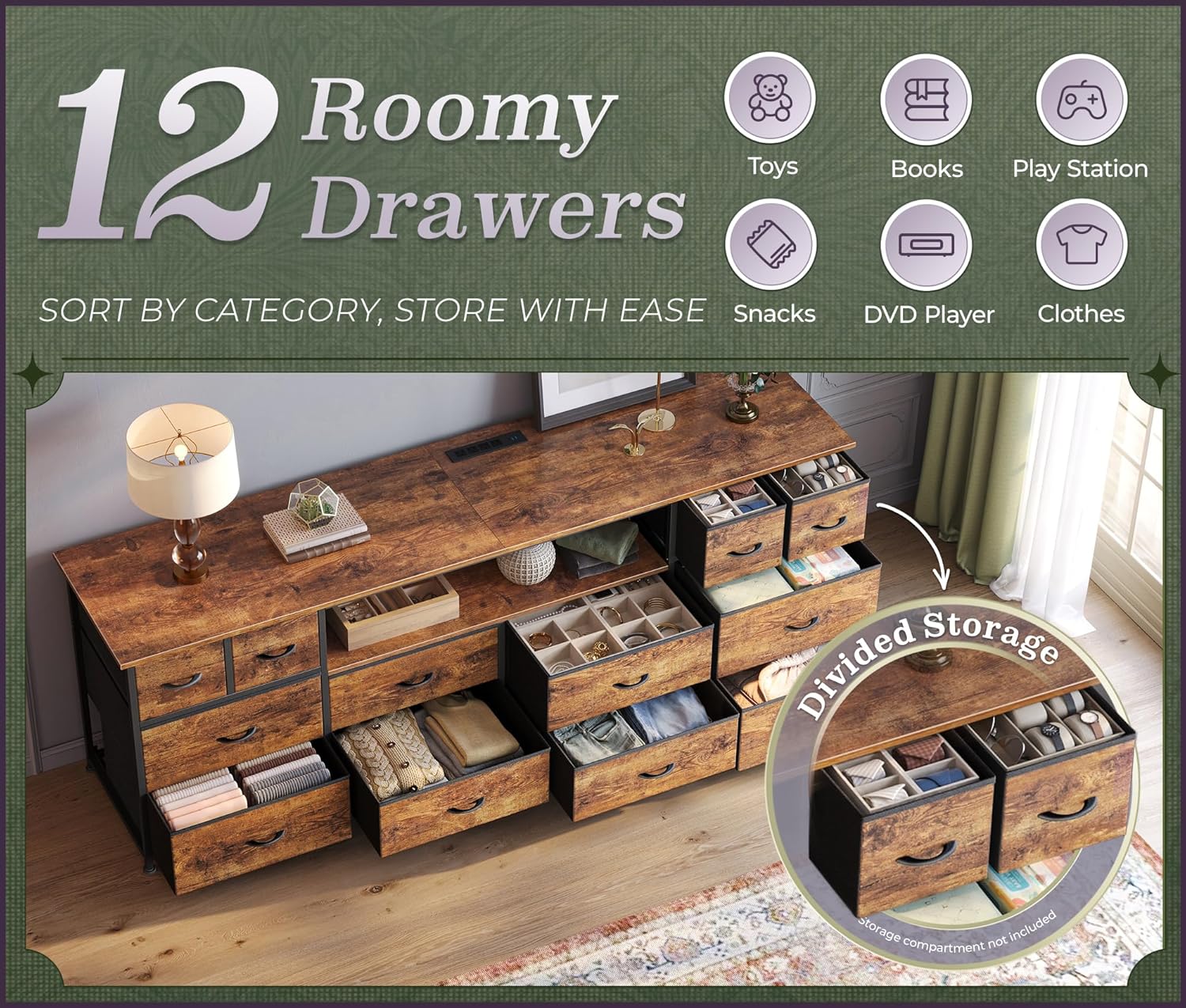 - 【12 Drawer Long TV Stand in 3 Sizes】With 12 drawers in 3 thoughtful sizes, this long dresser for bedroom has room for socks, sweaters, Xbox controllers, throw blankets, toys, you name it. The top drawers are great for the small stuff, and the deeper ones handle the rest