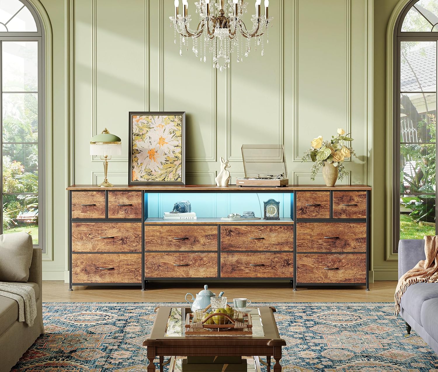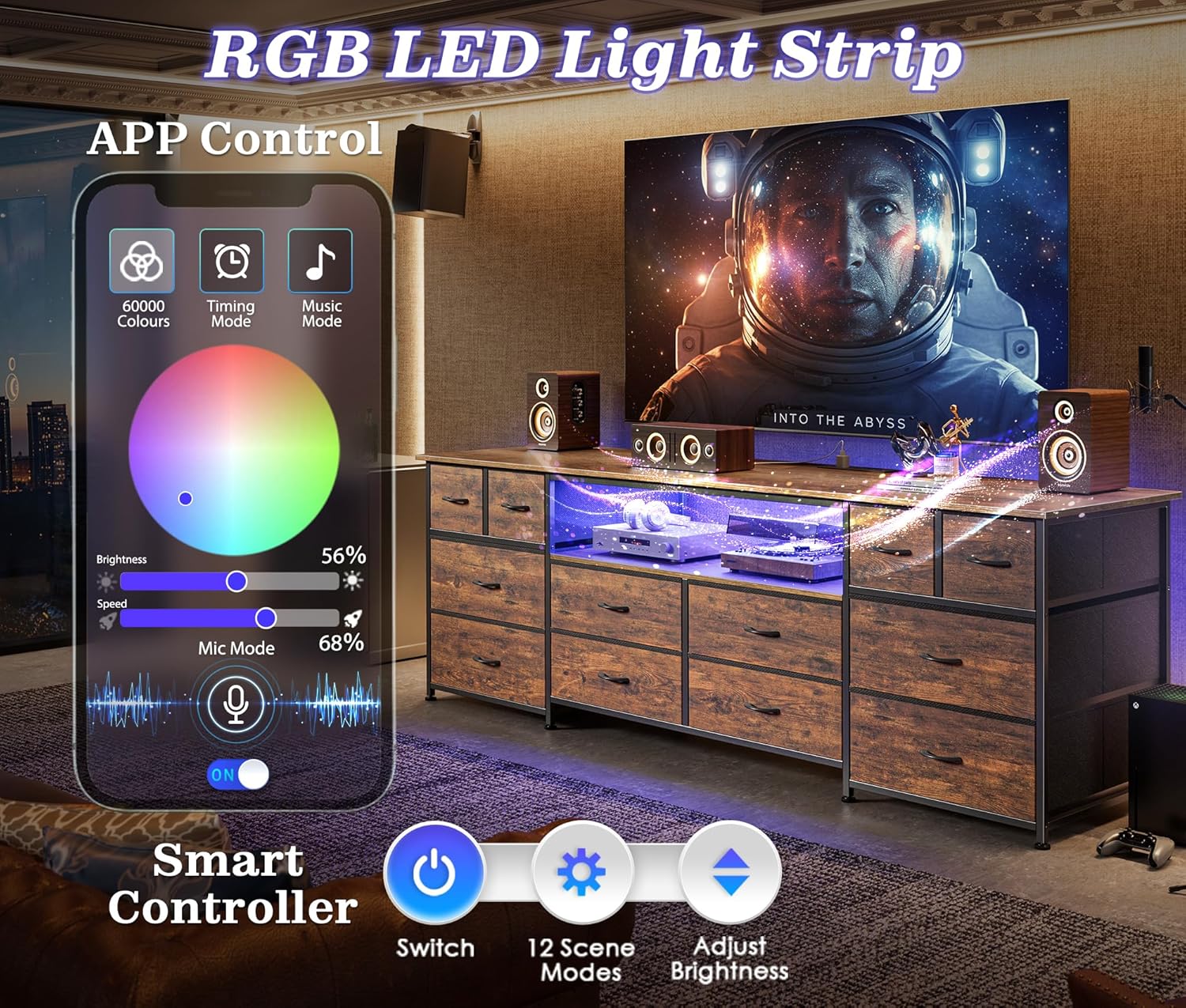 Huuger 70.9 Inch Dresser TV Stand with LED Lights, Power Outlets and USB-C Port, 12 Fabric Drawer Dresser for Bedroom, Wide Entertainment Center for 75, 80 Inch TV, Open Shelf, Rustic Brown