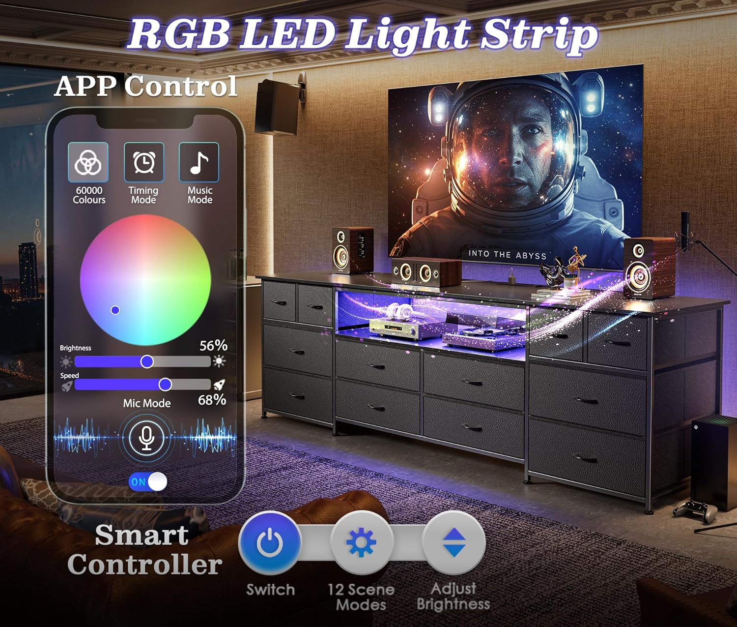 Huuger 70.9 Inch Dresser TV Stand with LED Lights, Power Outlets and USB-C Port, 12 Fabric Drawer Dresser for Bedroom, Wide Entertainment Center for 75, 80 Inch TV, Media Console, Open Shelf, Black
