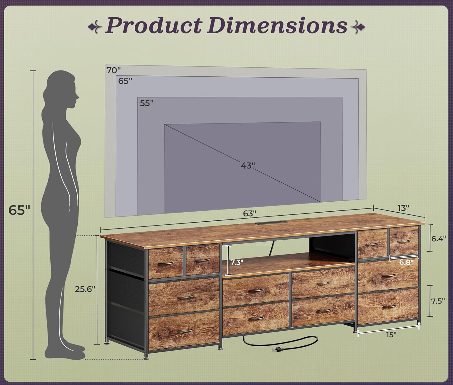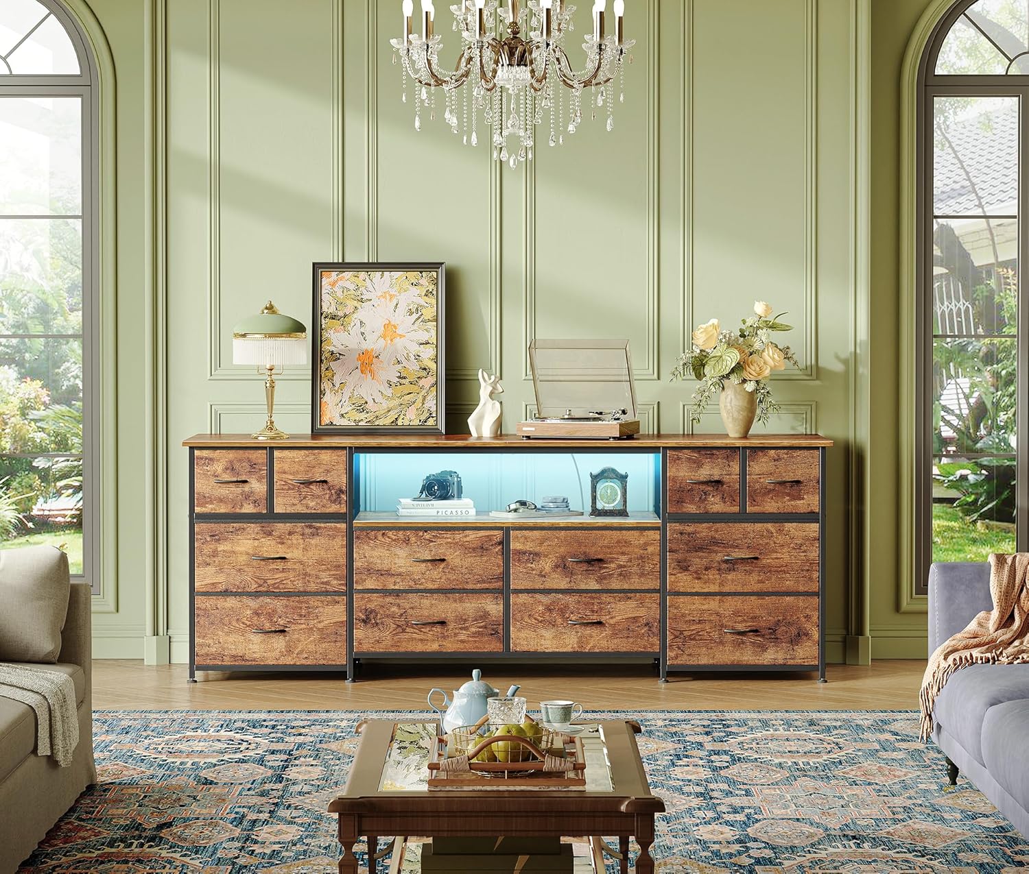 Huuger 63 Inch Dresser TV Stand with LED Lights, Power Outlets and USB-C Port, 12 Fabric Drawer Dresser for Bedroom, Entertainment Center for 65, 70 Inch TV, Media Console, Open Shelf, Rustic Brown