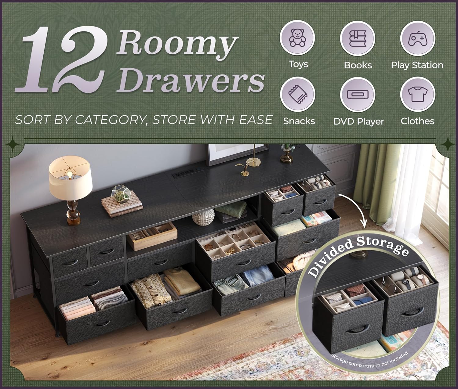 - 【12 Drawer Long TV Stand in 3 Sizes】With 12 drawers in 3 thoughtful sizes, this long dresser for bedroom has room for socks, sweaters, Xbox controllers, throw blankets, toys, you name it. The top drawers are great for the small stuff, and the deeper ones handle the rest