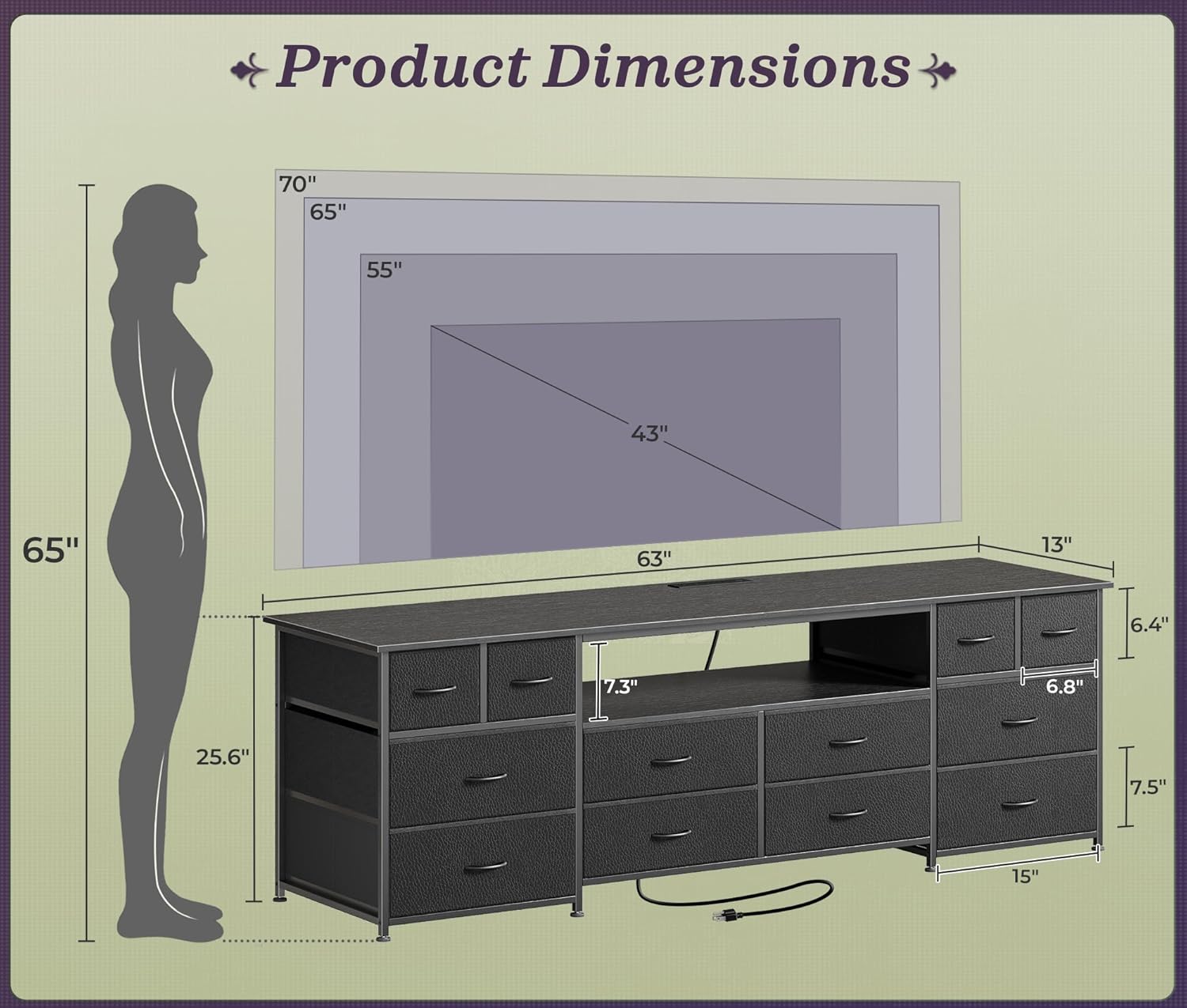 - 【Built-In Charging Station】This led dresser TV stand doubles as a power strip with 2 AC outlets, 2 USB ports, and 1 USB-C port. Perfectly placed for your TV, speakers, gaming systems, or bedside gadgets, keeping everything charged and within reach. With 63 inch long desktop, it can support 65, 70 inches TV