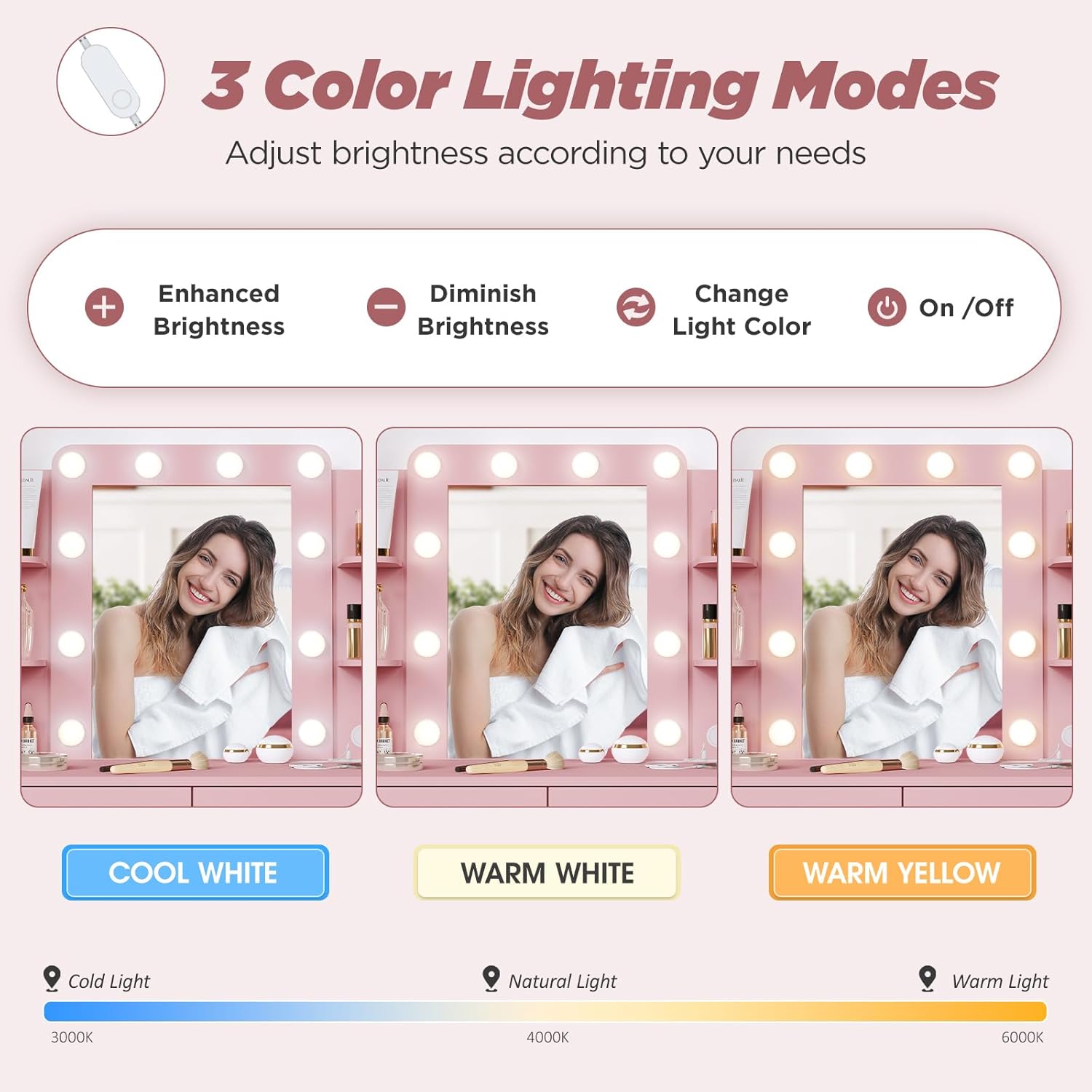 - 【3 Lighting Modes & Adjustable Brightness】This makeup vanity features 10 LED bulbs with three lighting modes (Natural, Warm, Cool) and adjustable brightness levels, offering ideal illumination for makeup application, skincare routines, or hairstyling in any lighting condition.