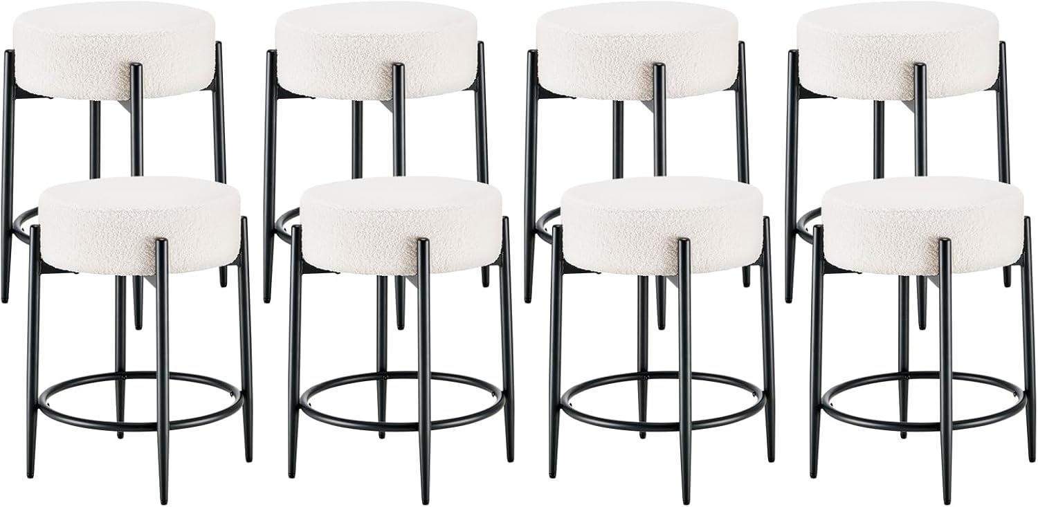 Dining Room Chairs Set of 8, 23.6" Sherpa Backless White Boucle Dining Chair, Mid Century Modern Living Room Round Upholstered Chairs with Black Metal Legs