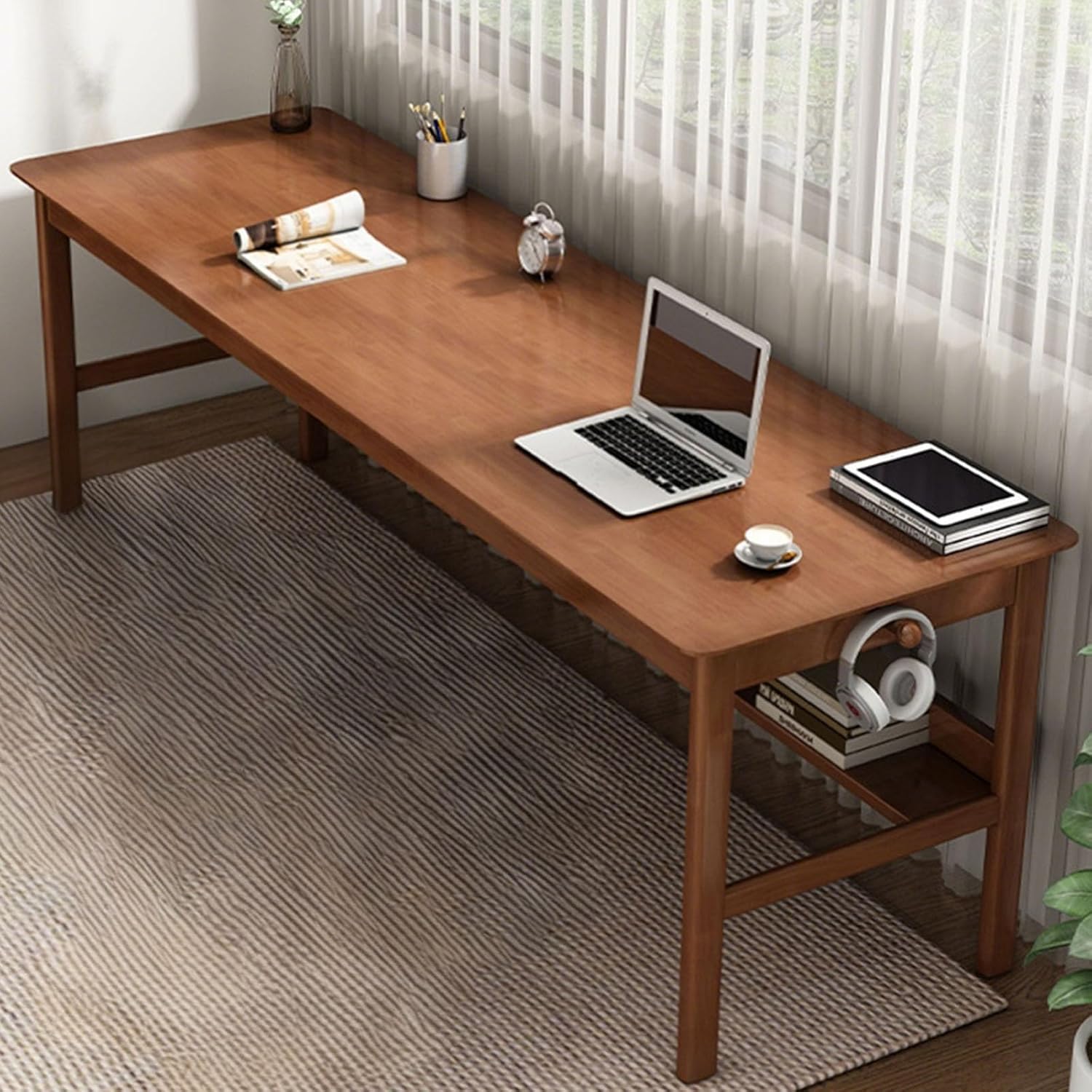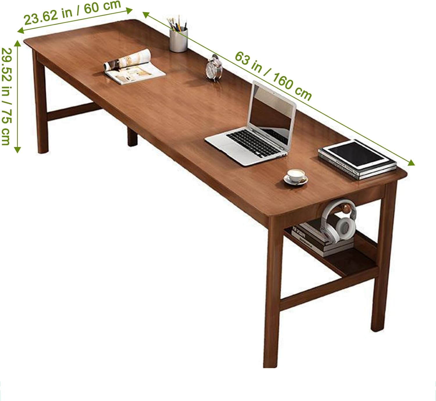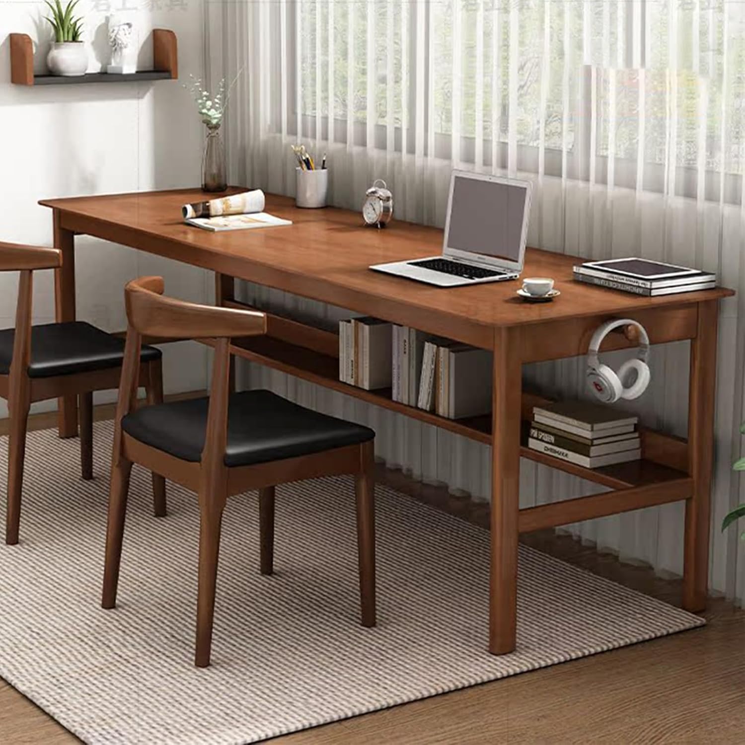 Solid Wood Long Desk 63 inch Home Office Work Desk, 2-Person Simple Writing Desk Table Computer Workstation with Storage Shelf for Living Room, Study Room, Bedroom, Walnut