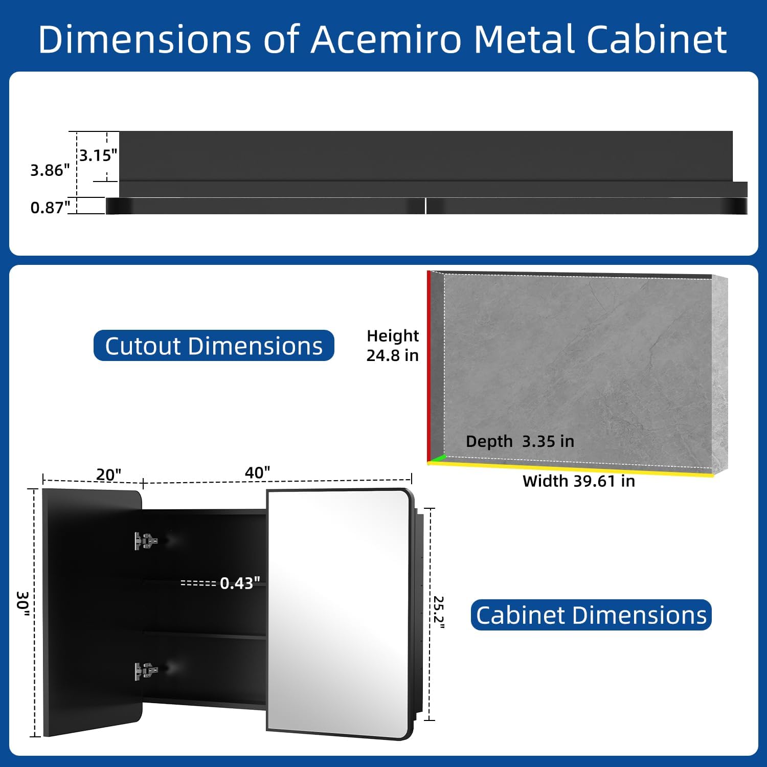 - Substantial and Durable Cabinet - ACEMIRO medicine cabinet is engineered with refined quality from robust metal that is built to last and withstand the daily wear and tear of a busy bathroom. The metal framed medicine cabinet with mirror seamlessly combines the aesthetic appeal of metallic luster with practicality for elevating bathroom décor.
