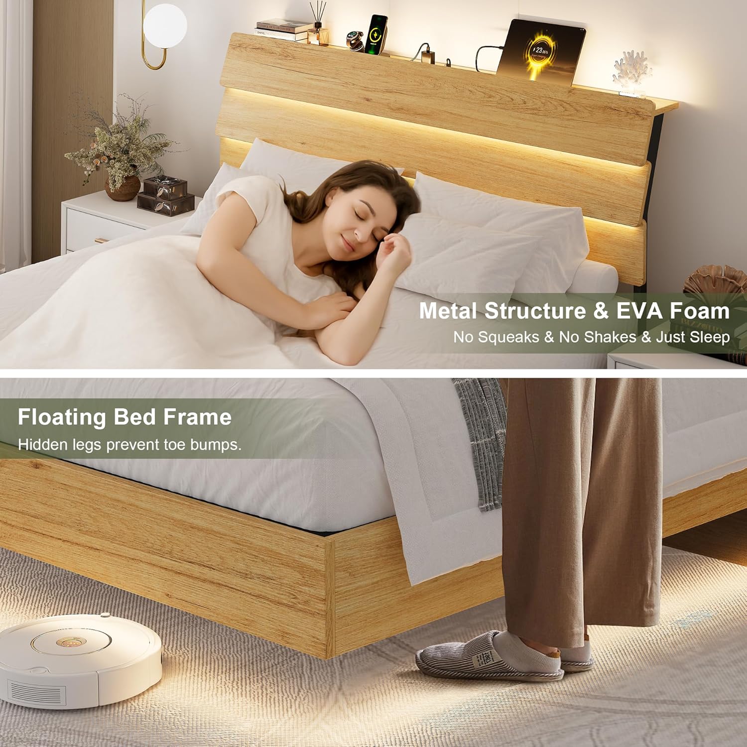 Feonase Floating Bed Frame King with Led Lights and Charging Station, Wood Full Size Bed Frame with Storage Headboard, Heavy Duty Metal Slats, No Box Spring Needed, Easy Assembly,Oak