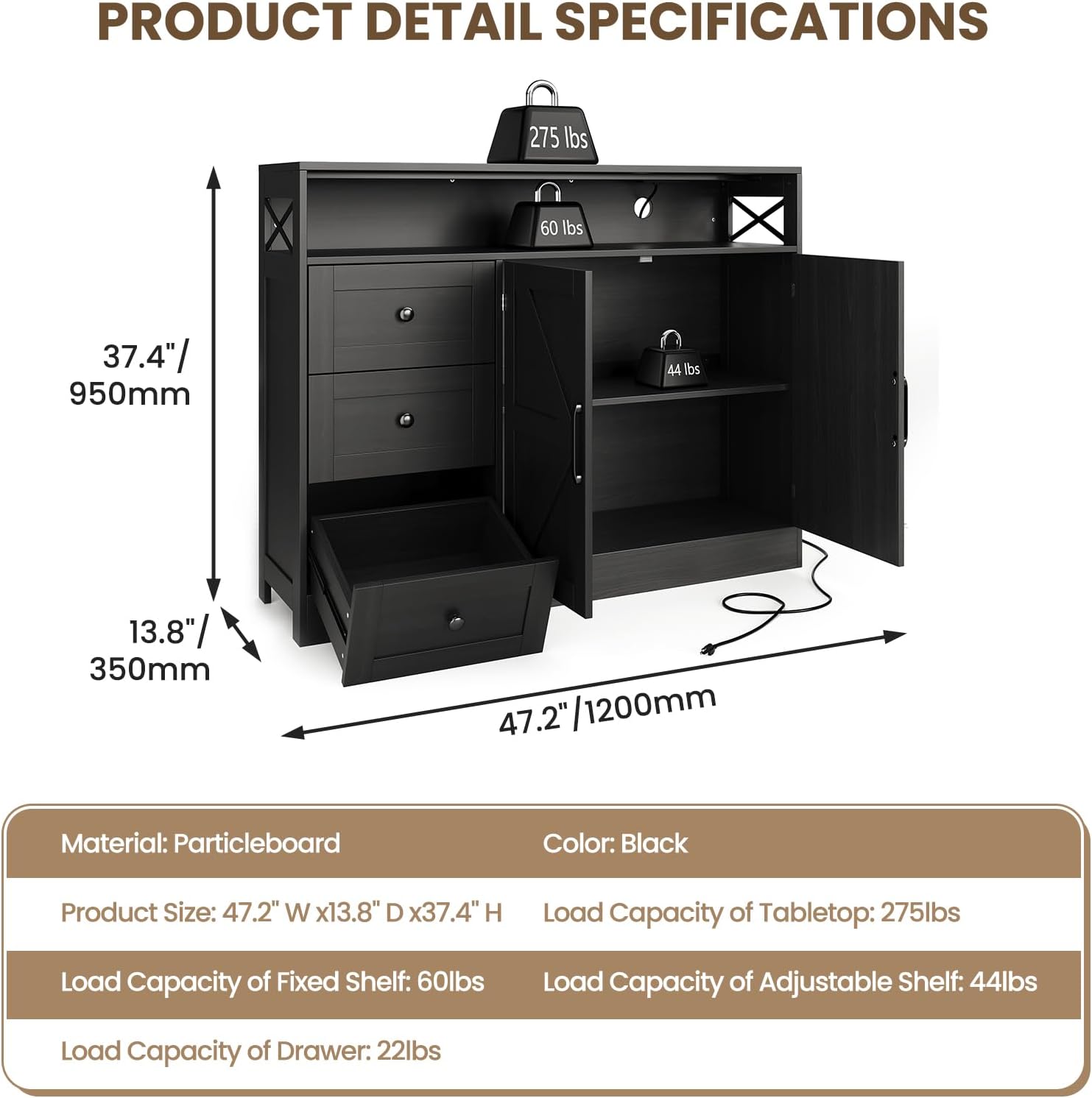 47inch Farmhouse Buffet Sideboard Cabinet, Wood Cupboard Storage Pantry Cabinet with Drawers, Coffee Bar Station Table for Kitchen Living Dining Room, Black