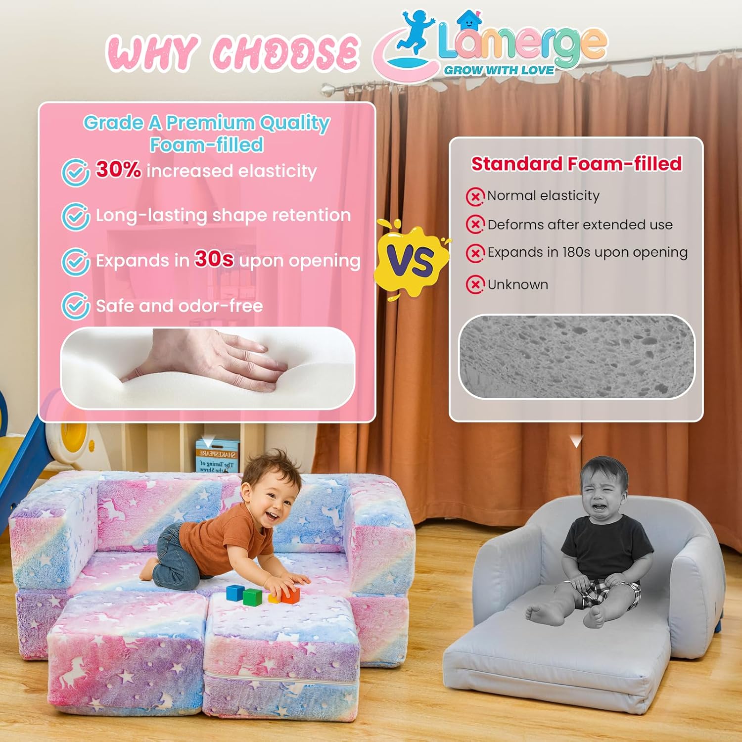 Lamerge Toddler Couch Glow in The Dark Toddler Fold Out Couch for playroom, Convertible Baby Fold Out Play Foam and Floor Cushion for Bedroom (Rainbow+Unicorn)