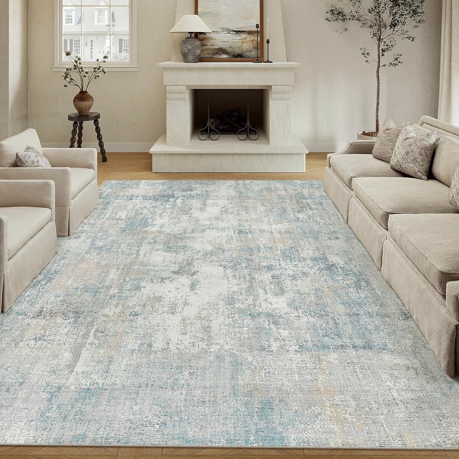 8x10 Washable Area Rug Blue Cream Modern Neutral Abstract Living Room Bedroom Indoor Floor Carpet Low Pile Soft Non-Slip Lightweight Vacuumable Large Throw Rug for Nursery Dining Room