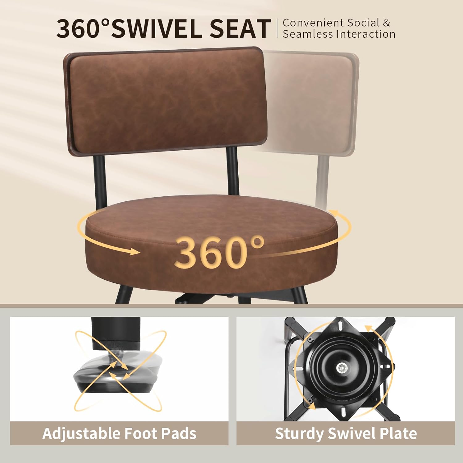 - 【STURDY METAL BASE & SWIVEL LEVELING FEET】The swivel bar chairs feature robust steel frame and splayed steel legs, forming a stable foundation. This design enhances the sturdiness and stability of the bar stools. Compared to wooden base barstools, metal base barstools are more suitable for pet-owning households. Additionally, the barstool legs feature swivel leveling feet that ensure stability even on slightly uneven surfaces, all while preventing floor scratches.