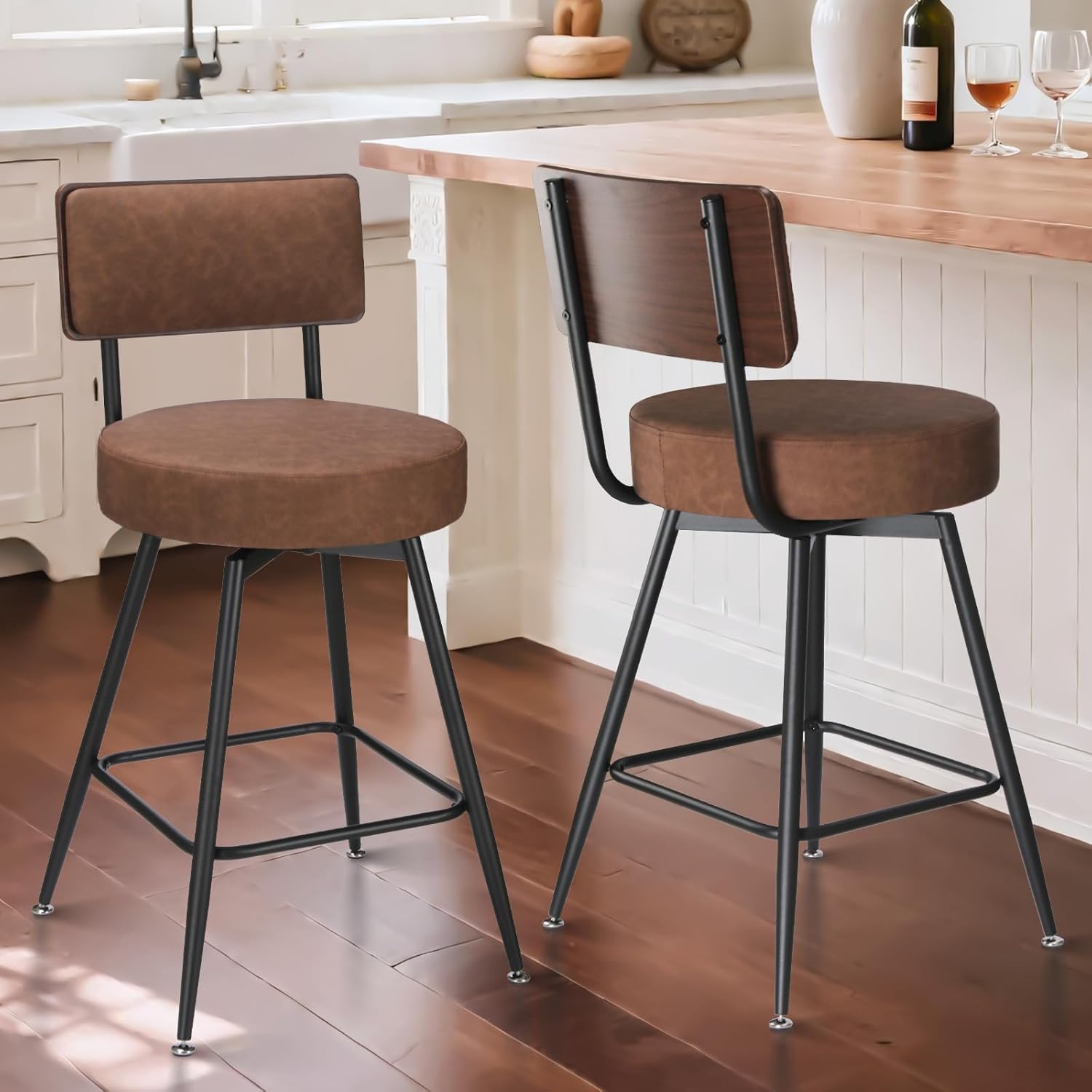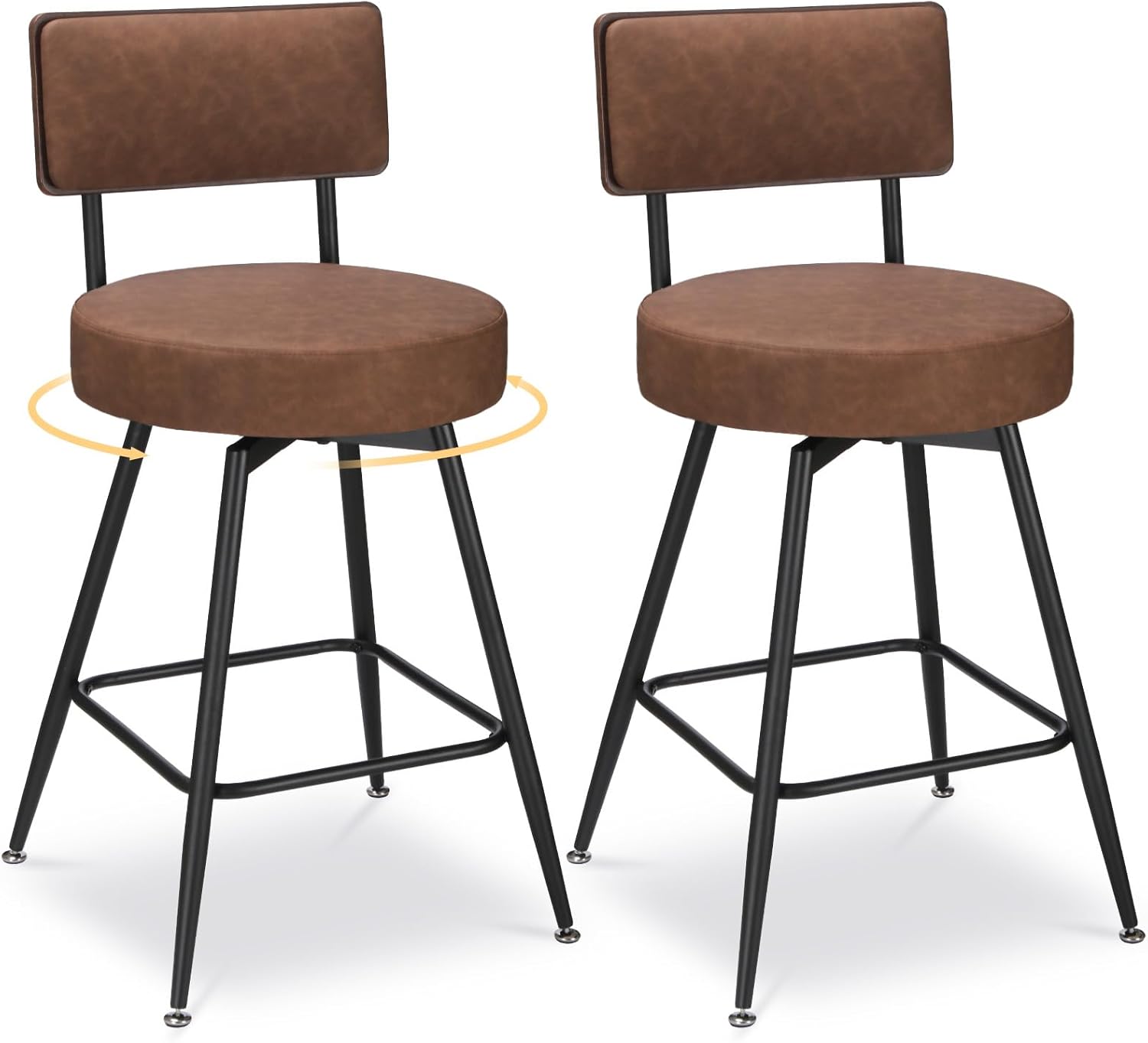 Bar Stools Set of 2, 25 Inch Swivel Bar Stools Bar Chairs, Faux Leather Counter Height Bar Stools with Backrest, Stools for Kitchen Counter Island Rustic Farmhouse, Brown