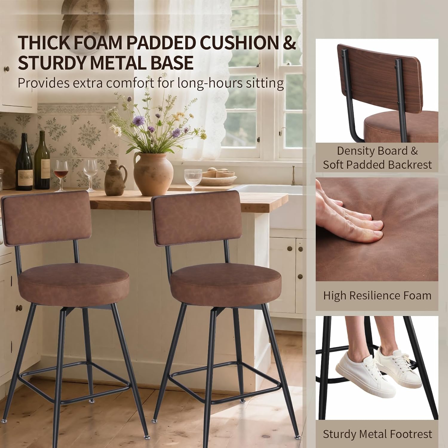 - 【360° SWIVEL BAR STOOLS】 The 25 inch counter height bar stools are designed with a swivel function, allowing for smooth and effortless rotation. Whether you are seated and engaging in conversation with friends or turning to retrieve items, these swivel bar stools offer enhanced convenience.