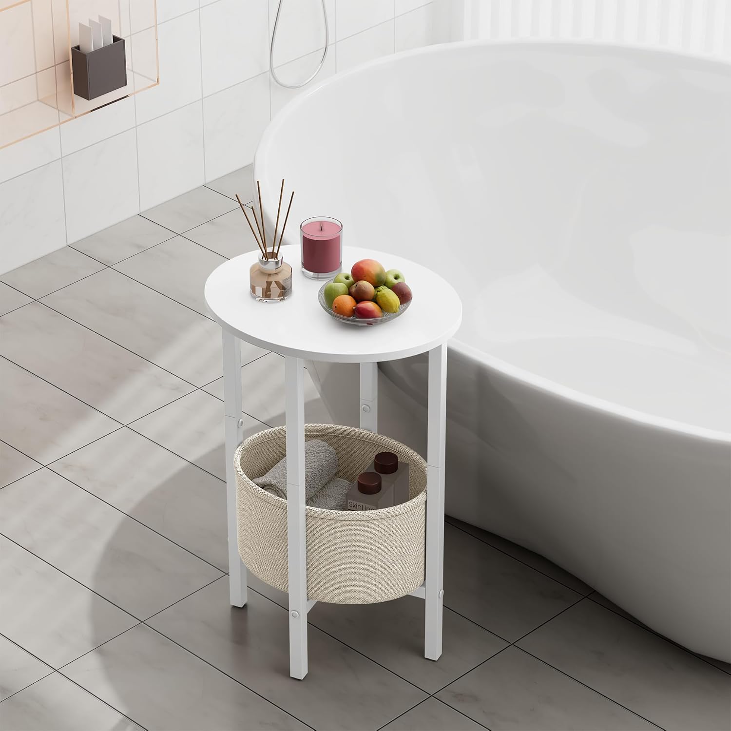 Vagusicc Round Side Table End Table with Storage Basket, Small Side Table Round Nightstand for Small Spaces, Tall Oval End Table with Steel Frame, Coffee Bedside Table for Living Room Bedroom, White