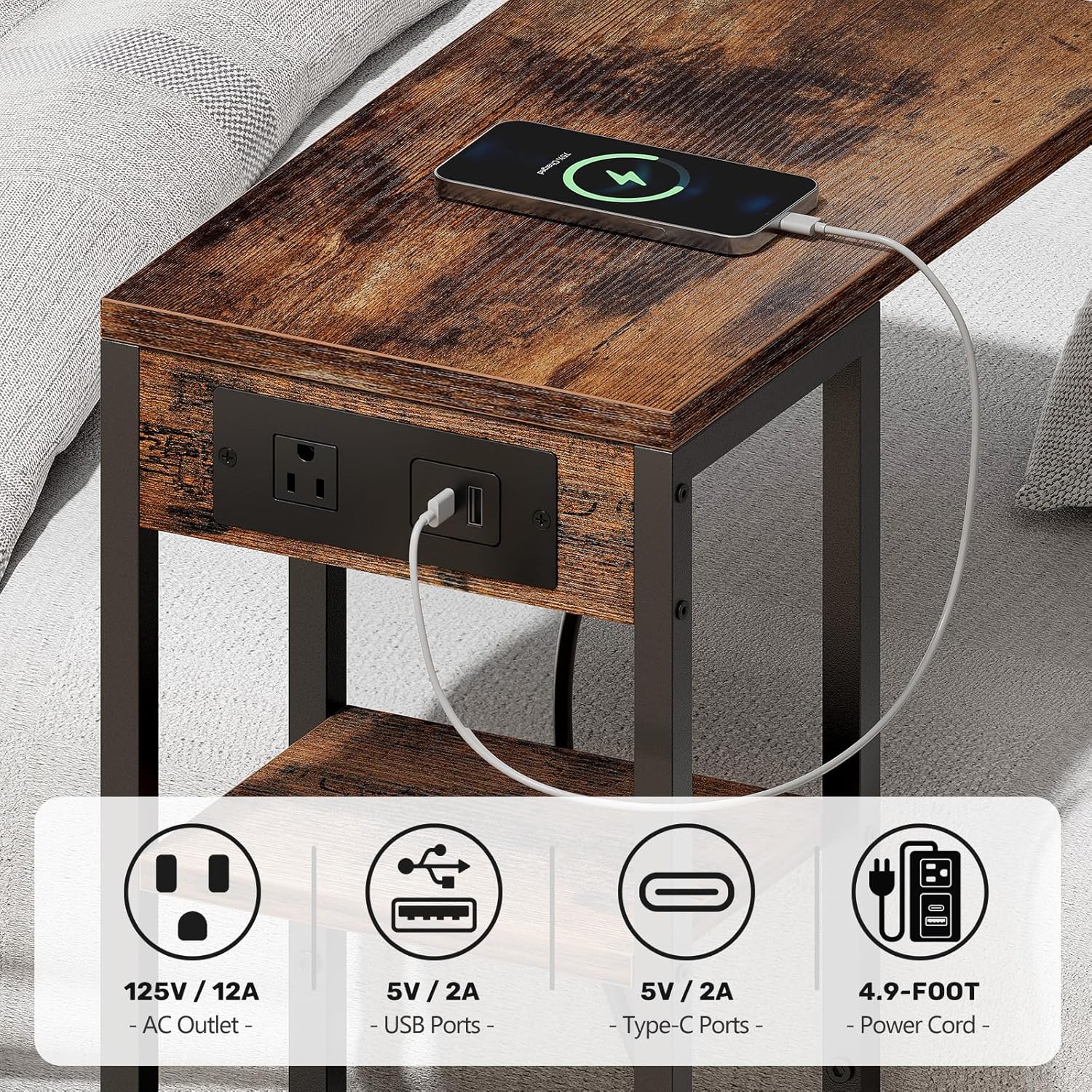 - ăEffortless Charging Within Reach ă: Sofa side table with AC Outlet,USB Port,and Type C Port,making it a breeze to charge your laptops,phones,tablets,and more,it features a side charging plate within easy reach. No tangled cords like traditional desks! Keep plugs easily accessible without bending down to find the socket among items on the shelf. 4.9ft power cord for a mobile charging station provides great convenience.